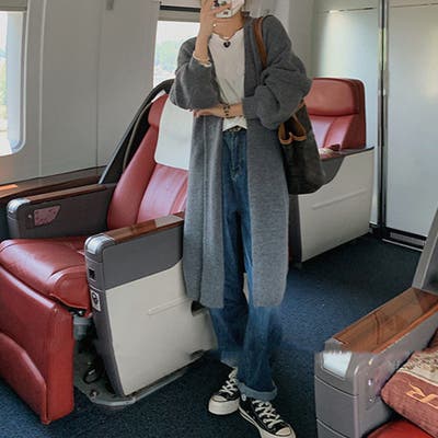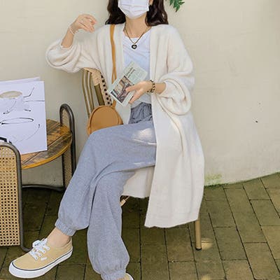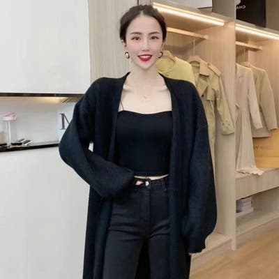 ゆったり羽織れるロング丈のボリュームスリーブトッパー仕様ニットカーディガン