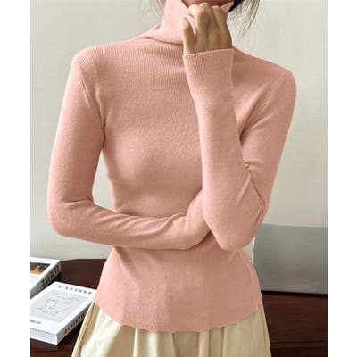 柔らかく滑らかな肌触りが魅力のリブ編みタートルネックニットトップス。