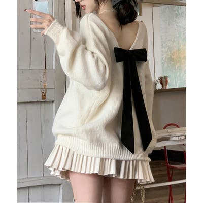 バックオープンリボンニットトップス韓国風