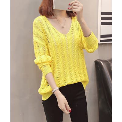 レディース Vネック クロシェ編み ニットプルオーバー ゆったり サマーニット 体型カバー 長袖メッシュニット セクシー
