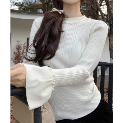 ネックラインと腕周りのパールデザインが上品で目を惹き、トレンド感満載のリブニットトップス。