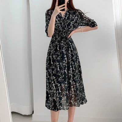 夏ワンピース細見え シフォンワンピ 黒 レトロ風フェミニン