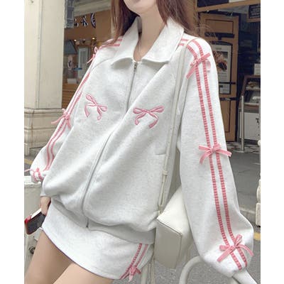 リボンと刺しゅうがアクセントになった、春秋新作のトレンド感あふれる長袖スウェットアウター。