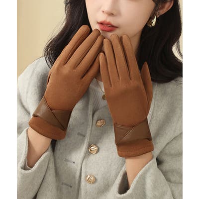 上品なシャムードとフェイクレザー異素材ミックスの裏起毛手袋。