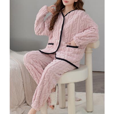 ケーブル柄ルームウェア セットアップ ポケット付き ふわふわ部屋着 軽く暖かい 長袖寝巻き もこもこボアパジャマ 冬防寒