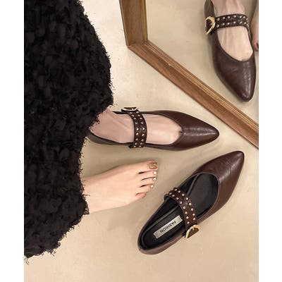 洗練されたポインテッドトゥとスタッズ付きストラップが印象的な、クラシカルモダンなフラットパンプス