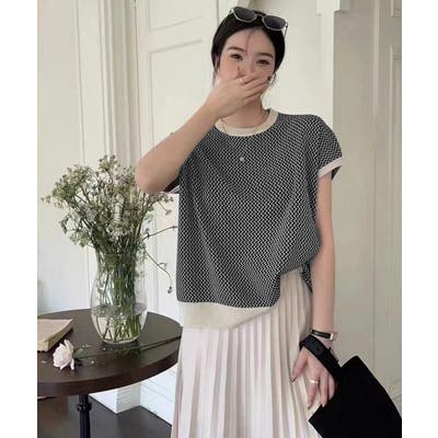 ノースリーブニットトップス きれいめ 柄ニットTシャツ ゆったり 体型カバー 半袖春夏トップス 丸首 薄手ニットソー韓国