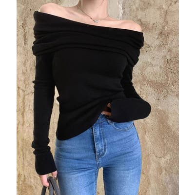 トレンドの折り返しデザインを取り入れたオフショルダーで、ヘルシーに肌見せできるニットトップス。