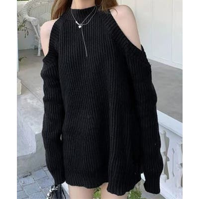レディース ショルダーカットニットチュニック セクシー肌見せニットセーター ハイネックリブニット ゆったり 韓国風秋冬服