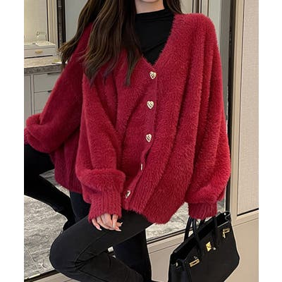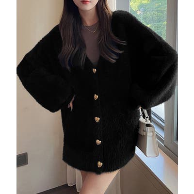 レディース ハートボタン秋冬ニット ミンクタッチカーディガン Vネックモヘヤセーター ゆったりニットトップス 大人可愛い