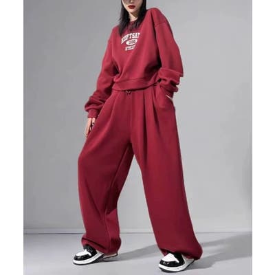 カレッジロゴが目を惹くスウェットトップスとワイドパンツのレディースセットアップ。