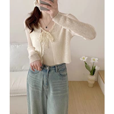 スカラップレースのリボンが可愛らしい印象を与えてくれるボウタイカーディガン。