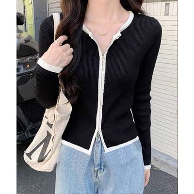 レディース 大人カジュアル フロントジップバイカラー リブニット 長袖 無地 タイトニット 着やせ セクシー