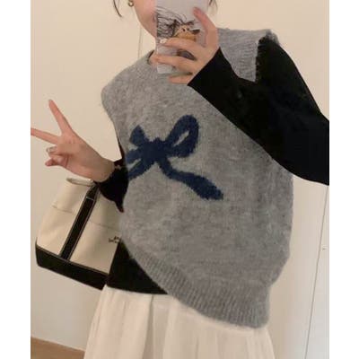 ニットトップス ノースリーブ リボン柄 編み 体型カバー 重ね着 着やせ 大人 可愛い カジュアル オルチャン 春秋冬