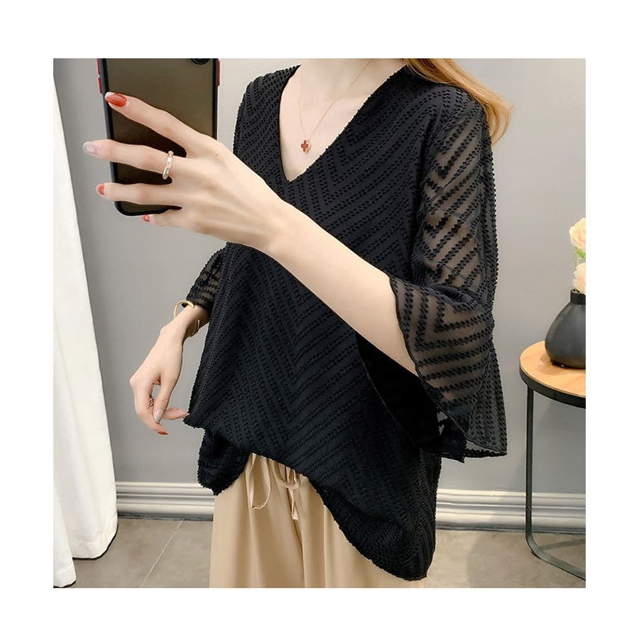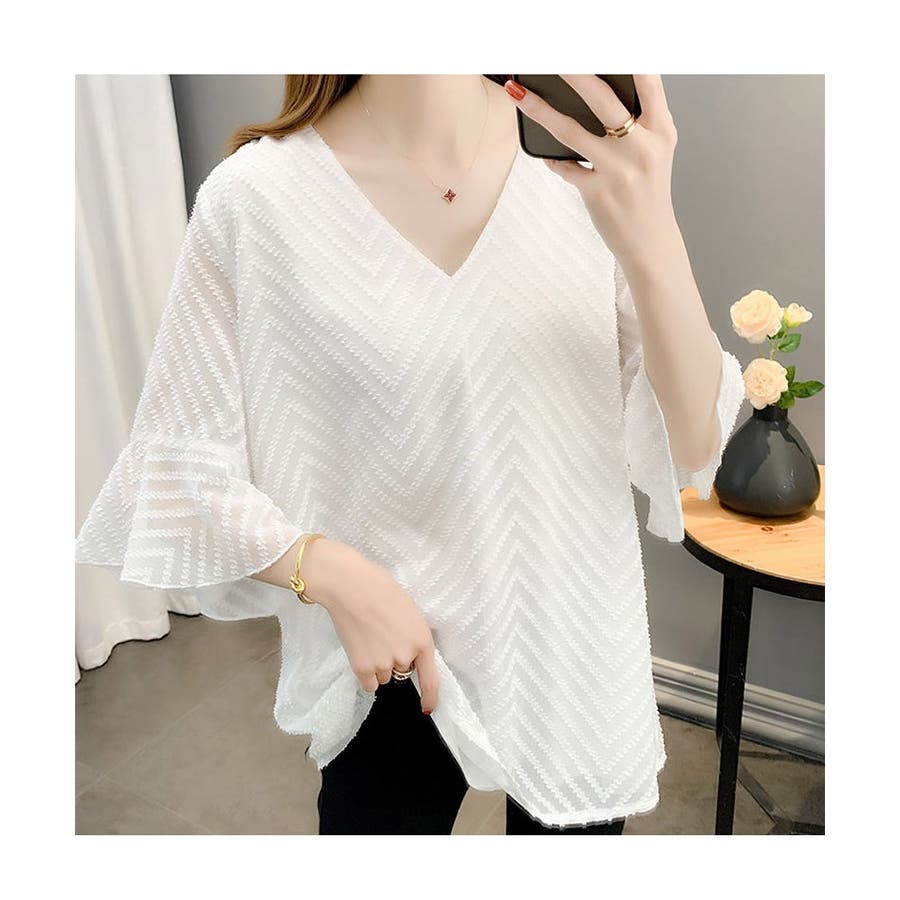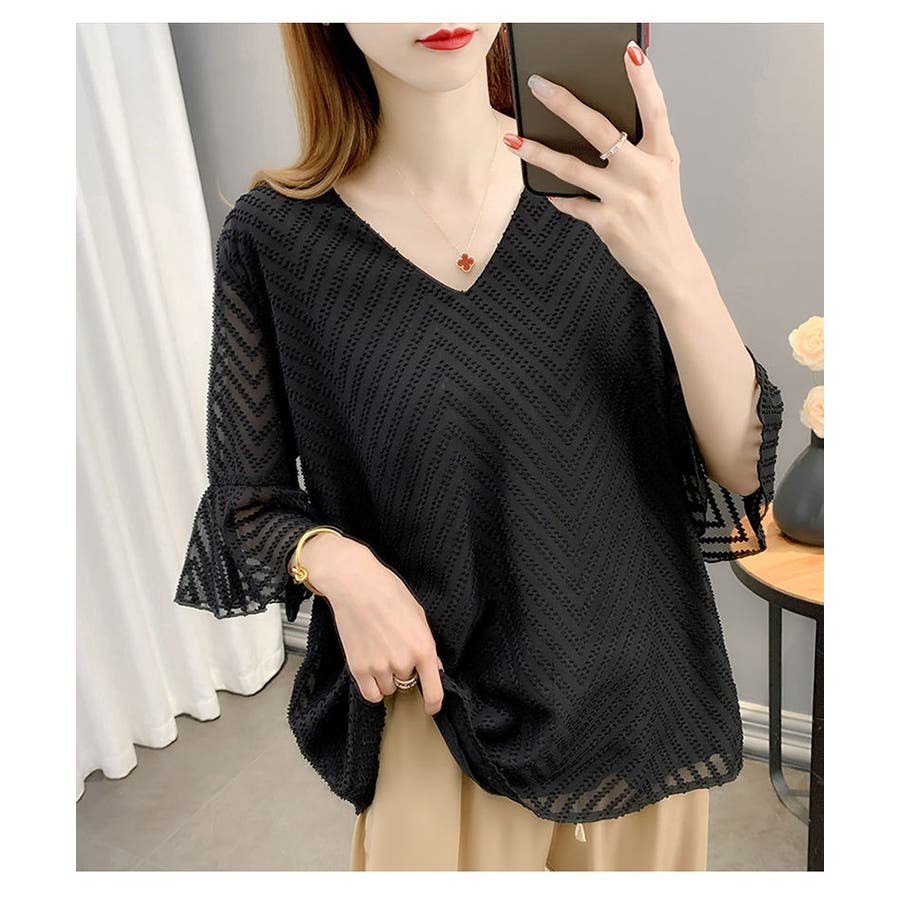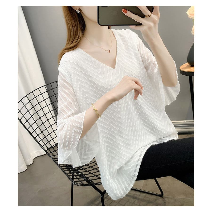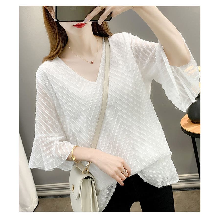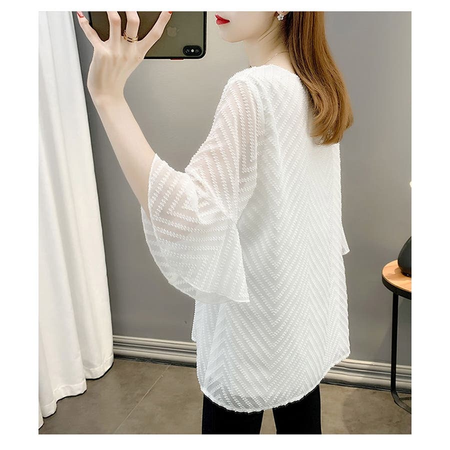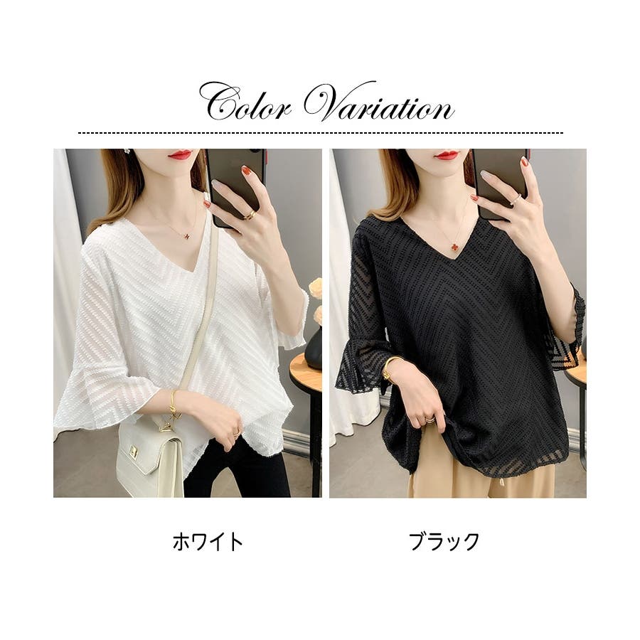 軽やかなシフォン素材が使用されており、フリル袖が女性らしさを引き立てます。