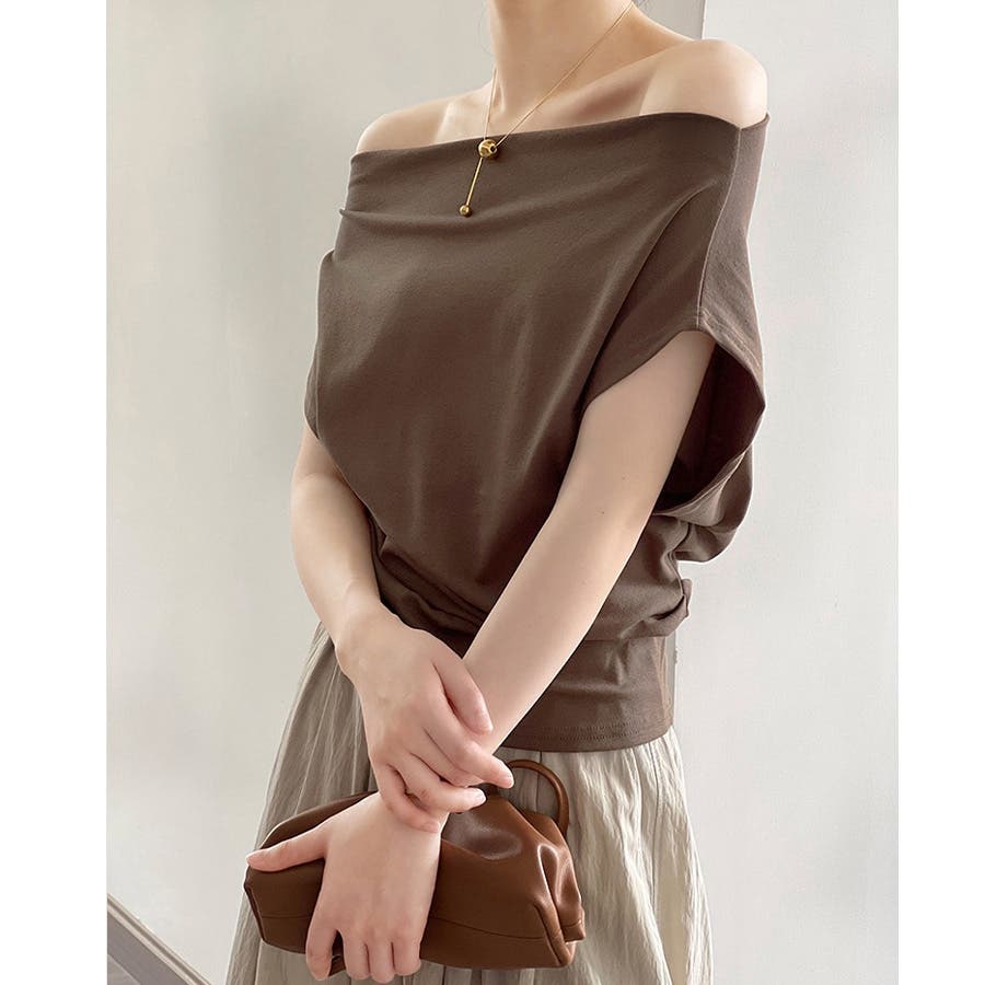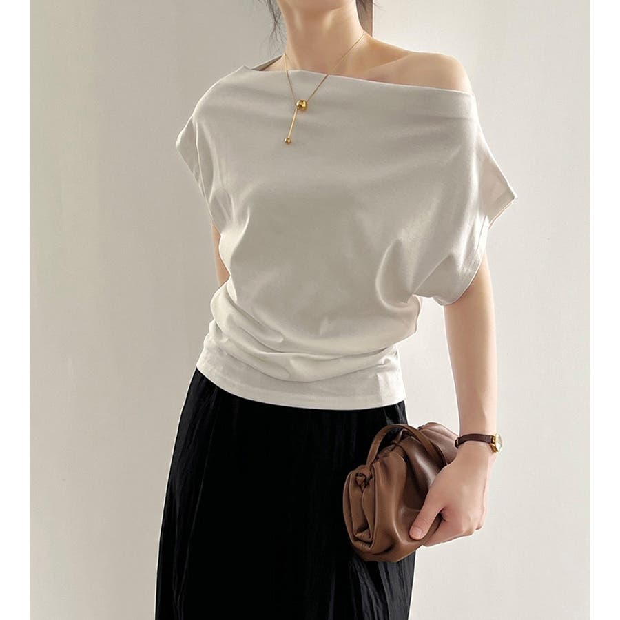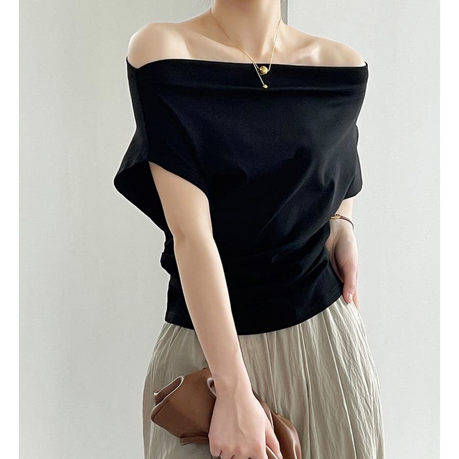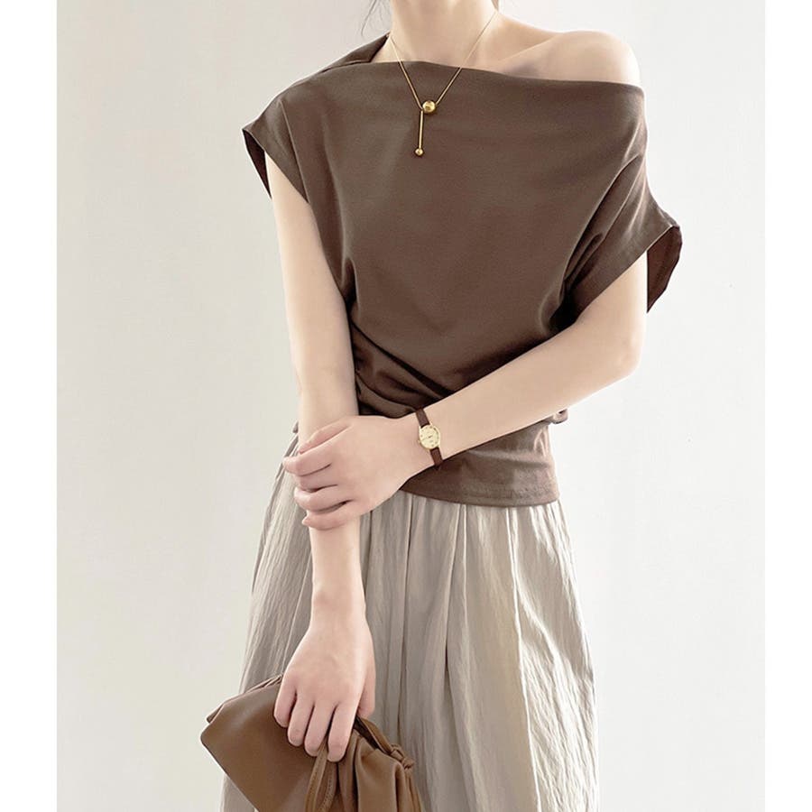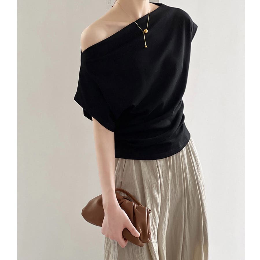 2wayで着こなせるため、さまざまなシーンで活躍します。韓国ファッションのエッセンスを取り入れたこのトップスは、鎖骨を引き立てるギャザーデザインが特徴です。