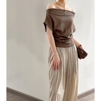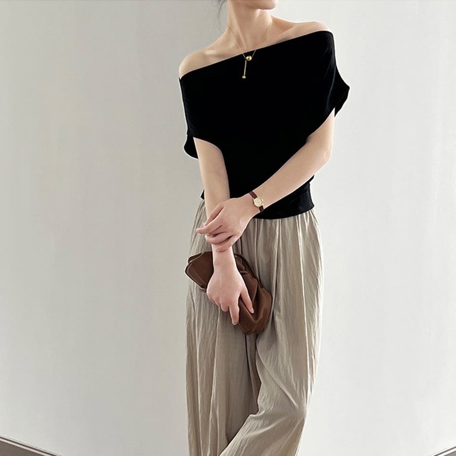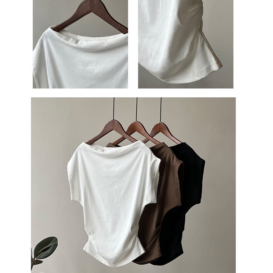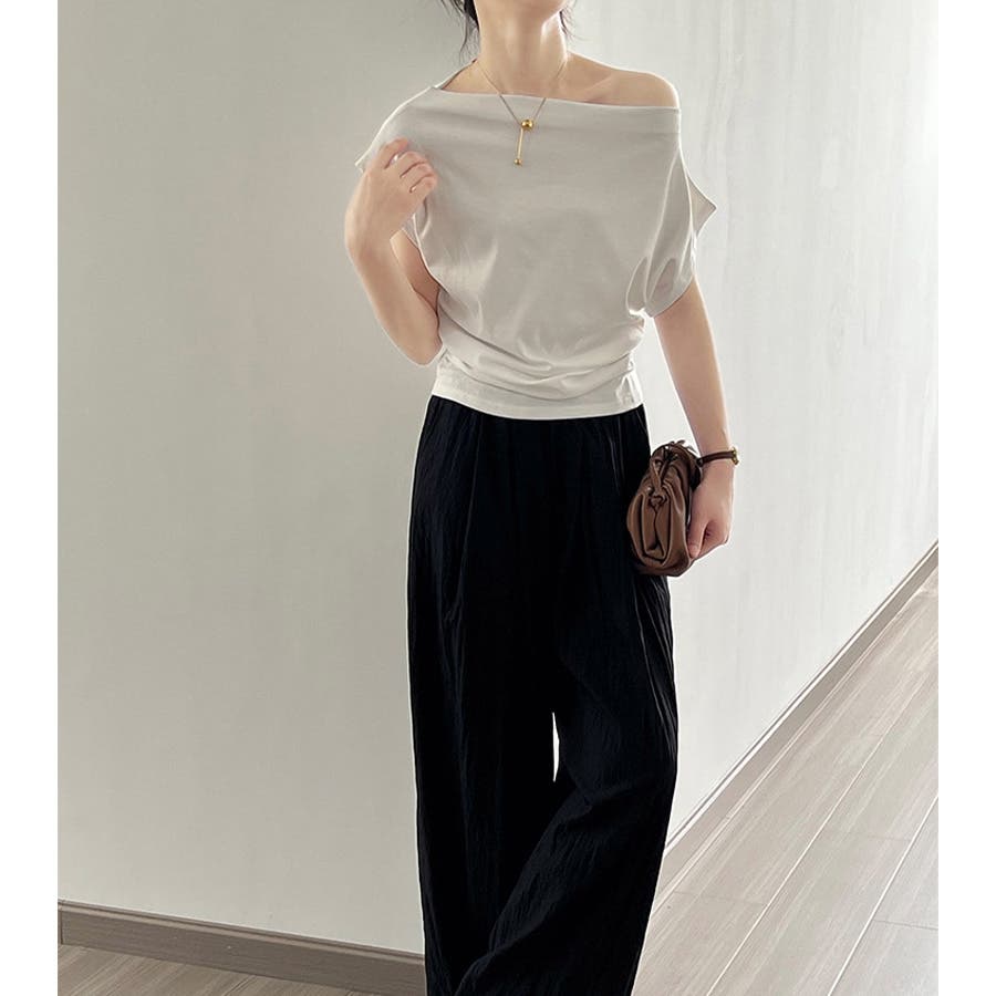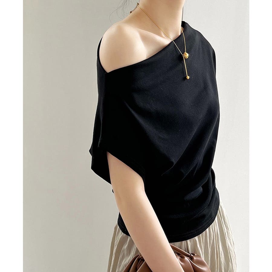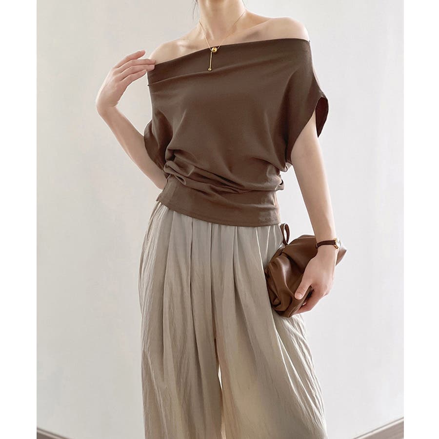 2wayで着こなせるため、さまざまなシーンで活躍します。韓国ファッションのエッセンスを取り入れたこのトップスは、鎖骨を引き立てるギャザーデザインが特徴です。