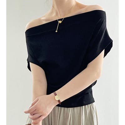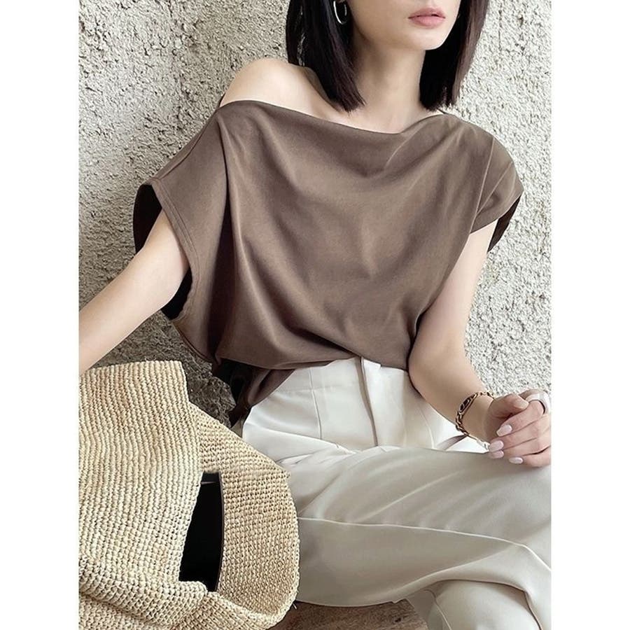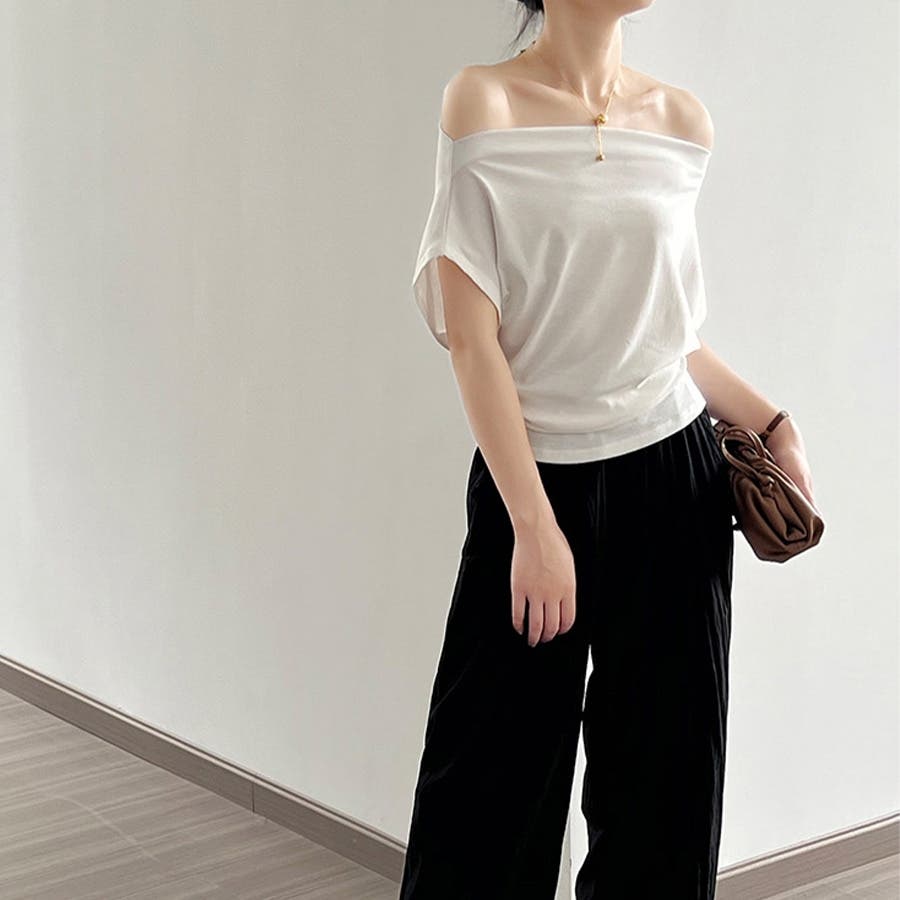 オフショルダーのスタイルがデコルテを美しく見せ、カジュアルながらもおしゃれな印象を与えます。