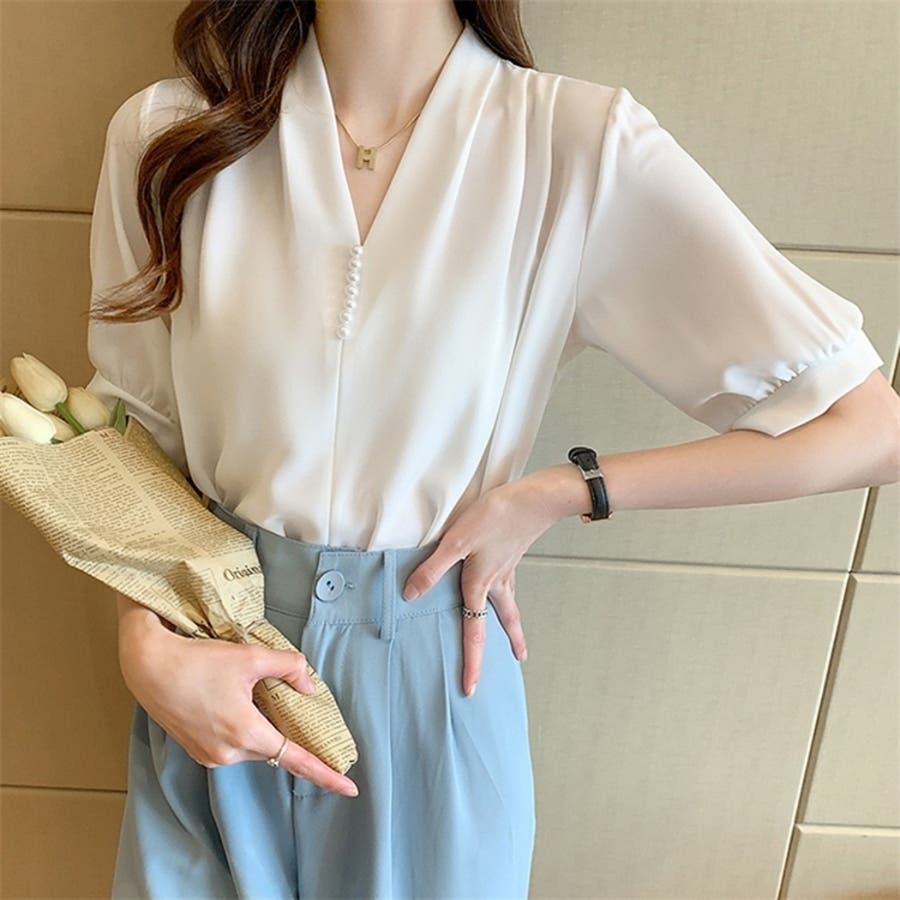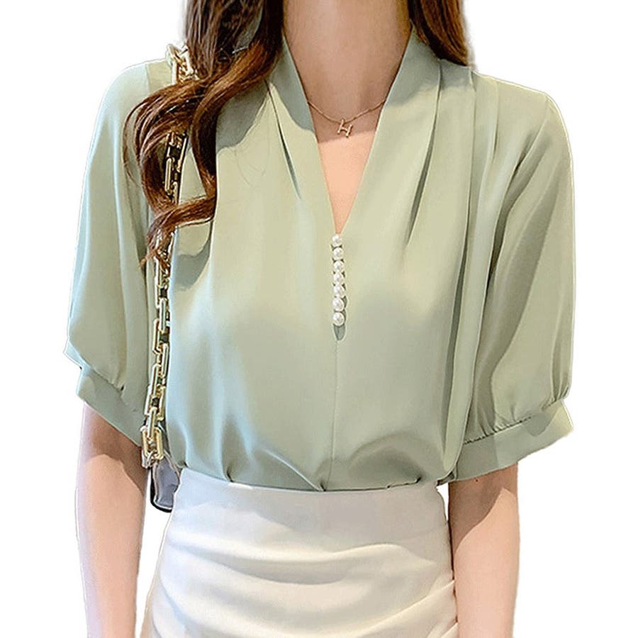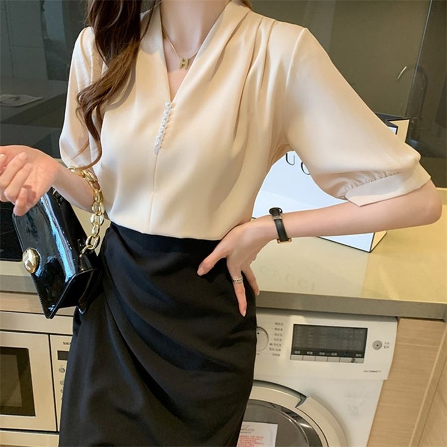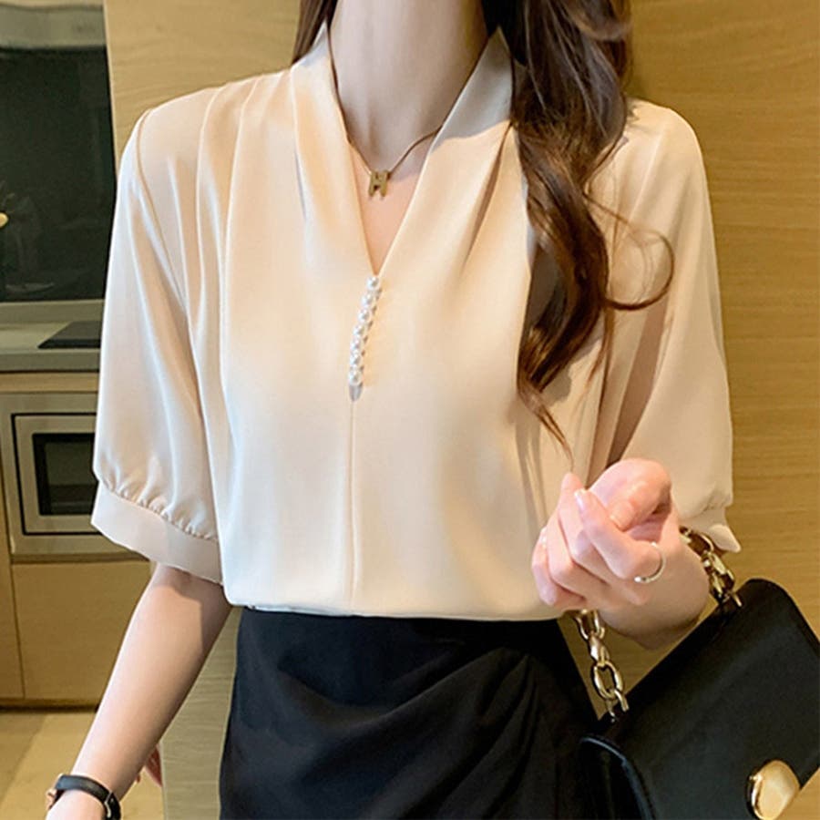 このパール付きVネックブラウスは、春夏のオフィスシーンに最適な一枚です。