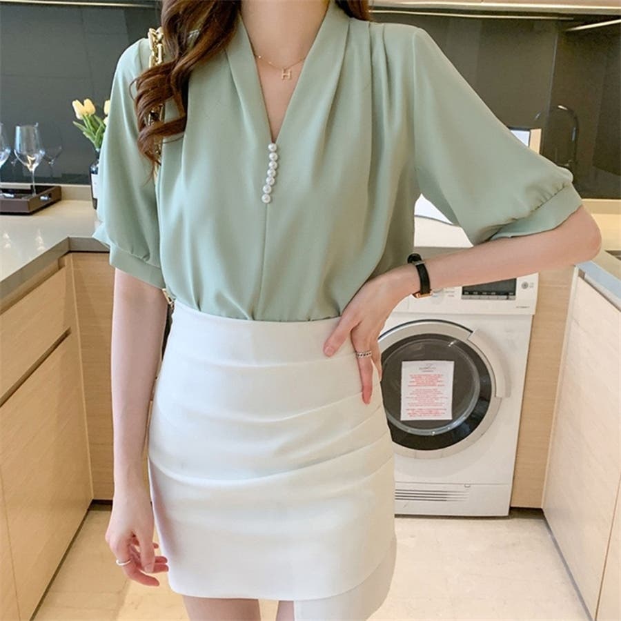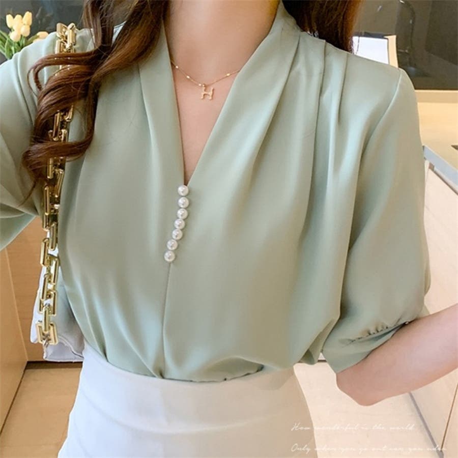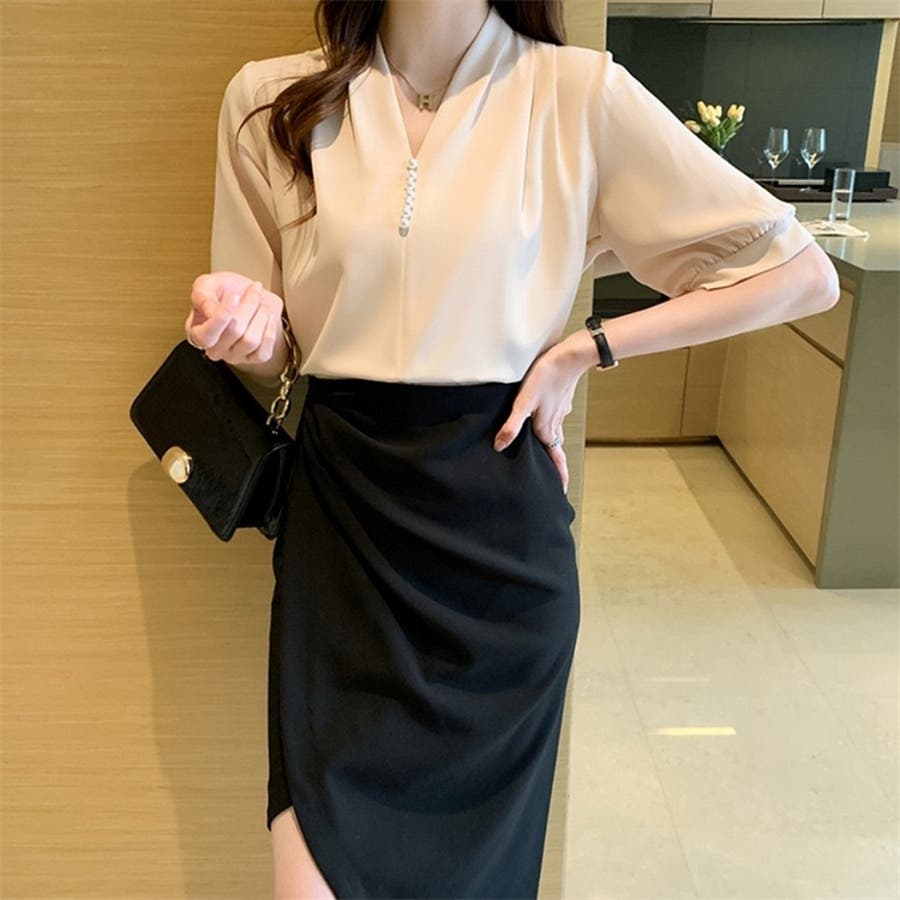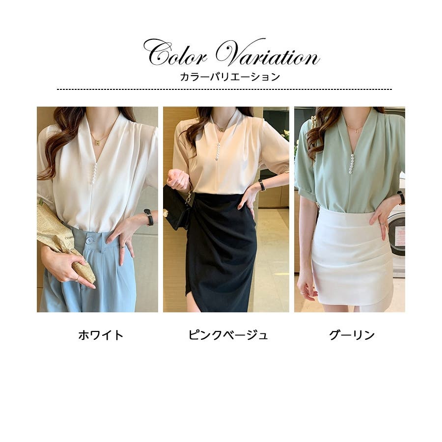 このパール付きVネックブラウスは、春夏のオフィスシーンに最適な一枚です。