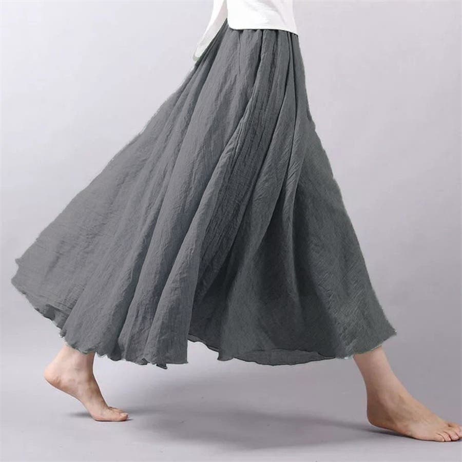 リネンタッチフレアスカートは、麻と綿の混紡素材を使用し、自然な風合いと快適な着心地を提供します。