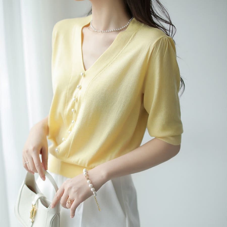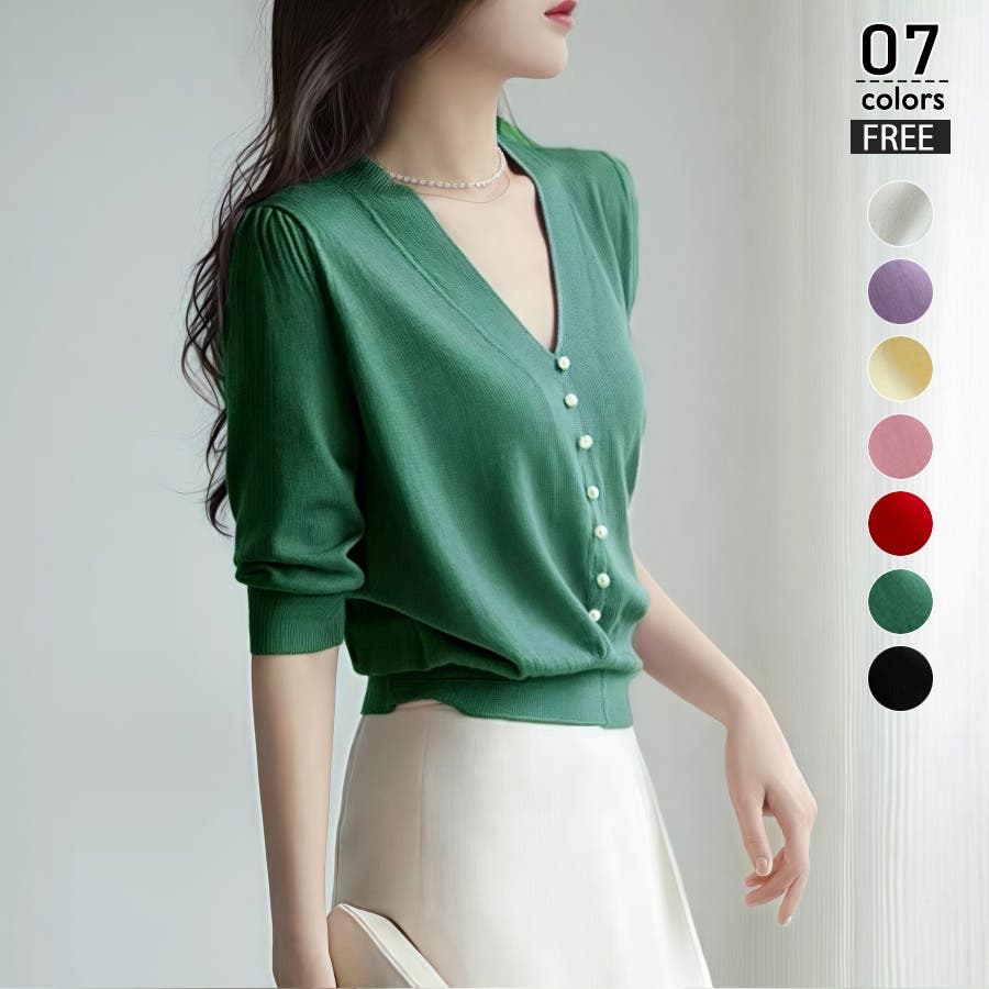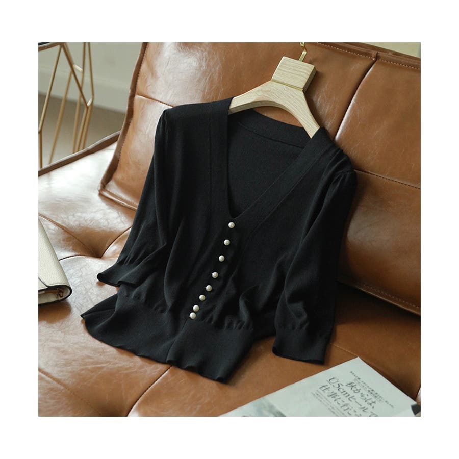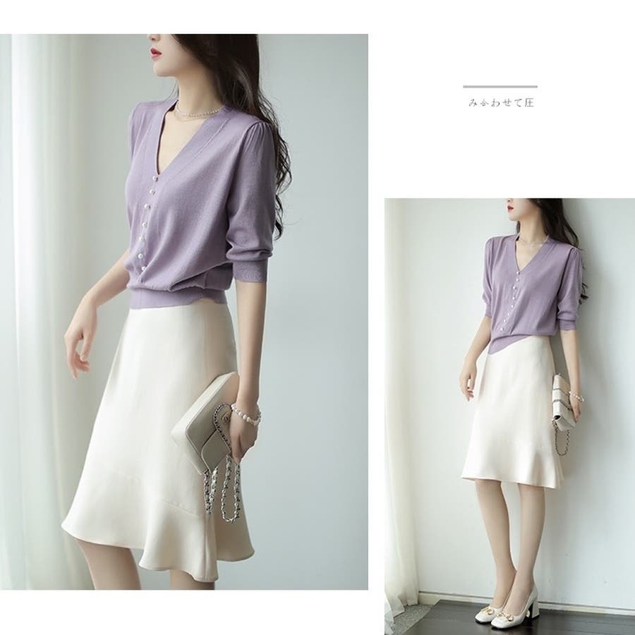 この春夏にぴったりのサマーニットカーディガンは、軽やかで涼しげな素材感が魅力です。淡い色合いのVネックデザインが、顔周りをすっきりと見せてくれるため、どんなシーンでも活躍します。フロントのボタンがアクセントになっており、シンプルながらも上品な印象を与えます。 長袖でありながら薄手の素材を使用しているため、紫外線対策にも効果的です。通勤やカジュアルなお出かけにも最適で、体型カバーも期待できるゆったりとしたデザインです。