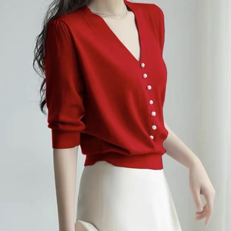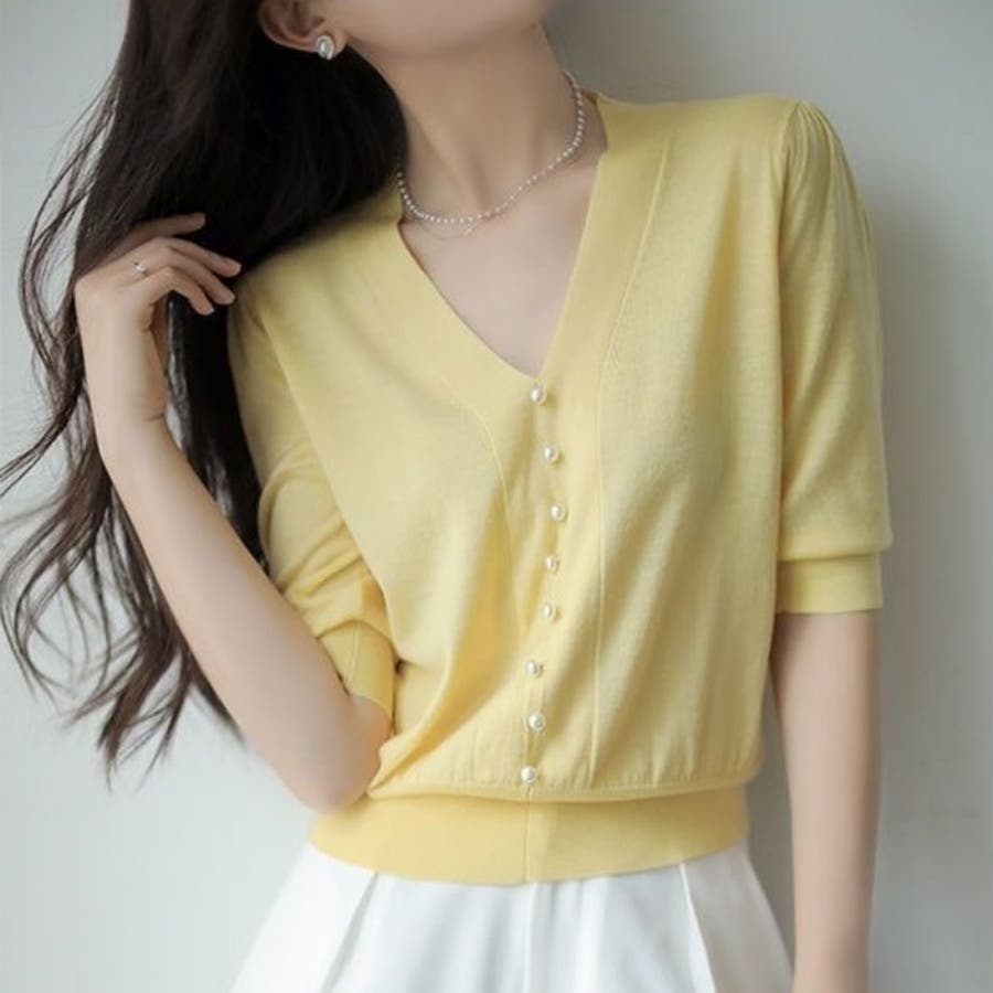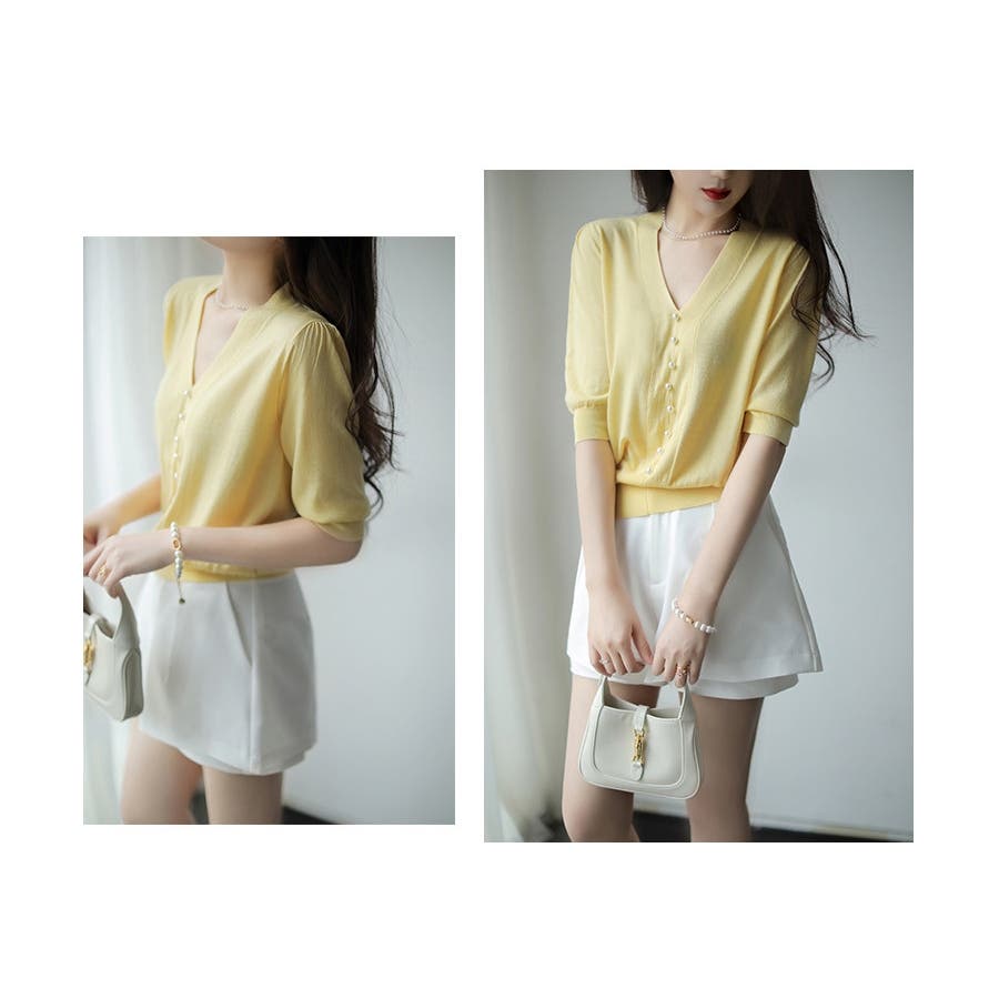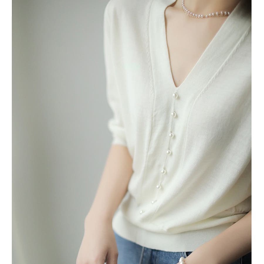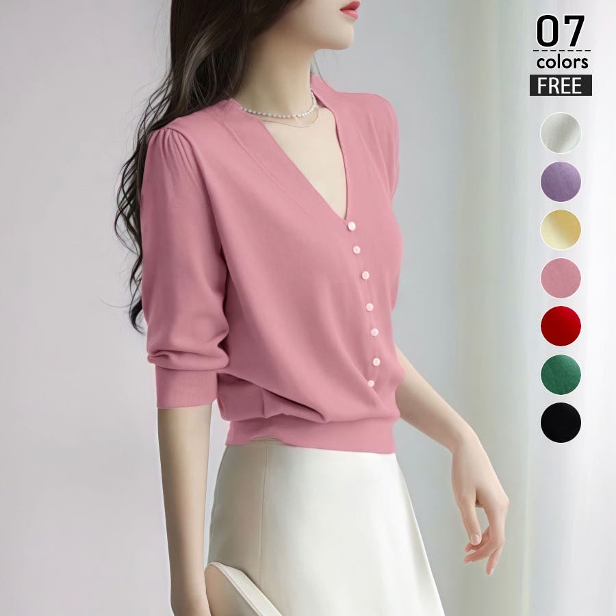 この春夏にぴったりのサマーニットカーディガンは、軽やかで涼しげな素材感が魅力です。淡い色合いのVネックデザインが、顔周りをすっきりと見せてくれるため、どんなシーンでも活躍します。フロントのボタンがアクセントになっており、シンプルながらも上品な印象を与えます。 長袖でありながら薄手の素材を使用しているため、紫外線対策にも効果的です。通勤やカジュアルなお出かけにも最適で、体型カバーも期待できるゆったりとしたデザインです。