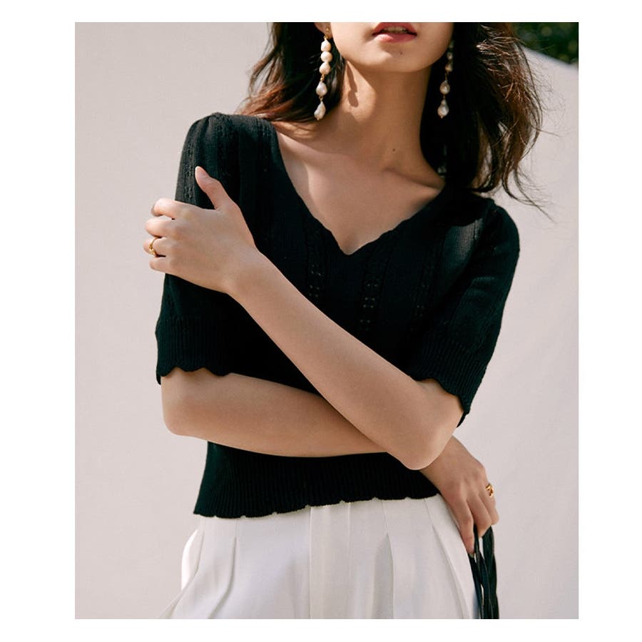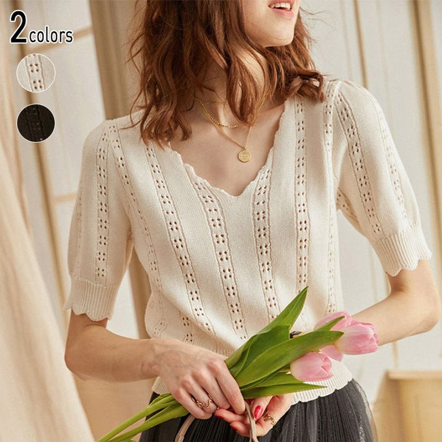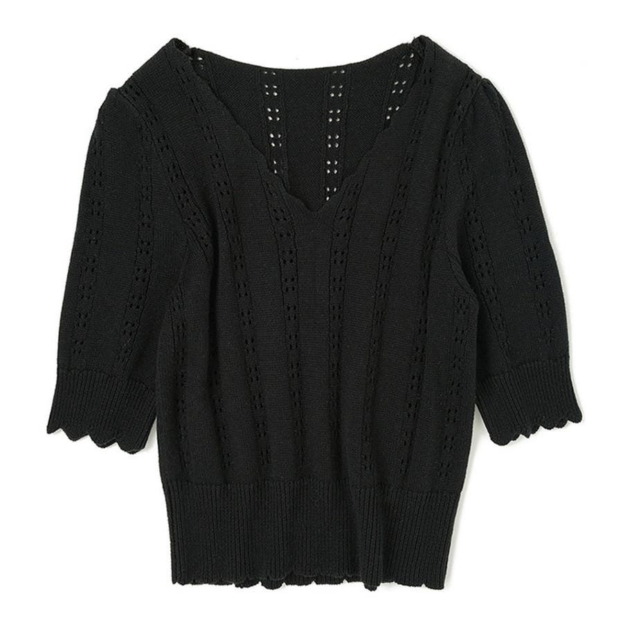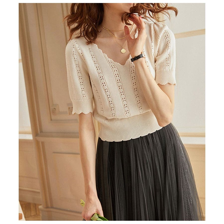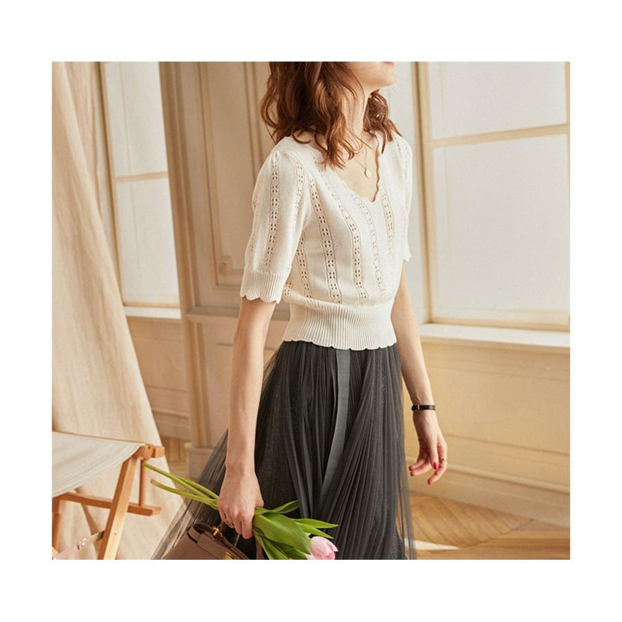 透かし編み 五分袖ニットトップス品の良さと女らしさを演出できる繊細な透かし編みの五分袖ニットトップス。