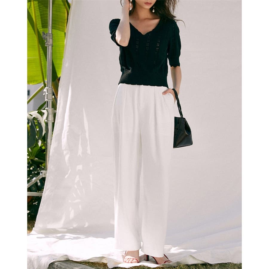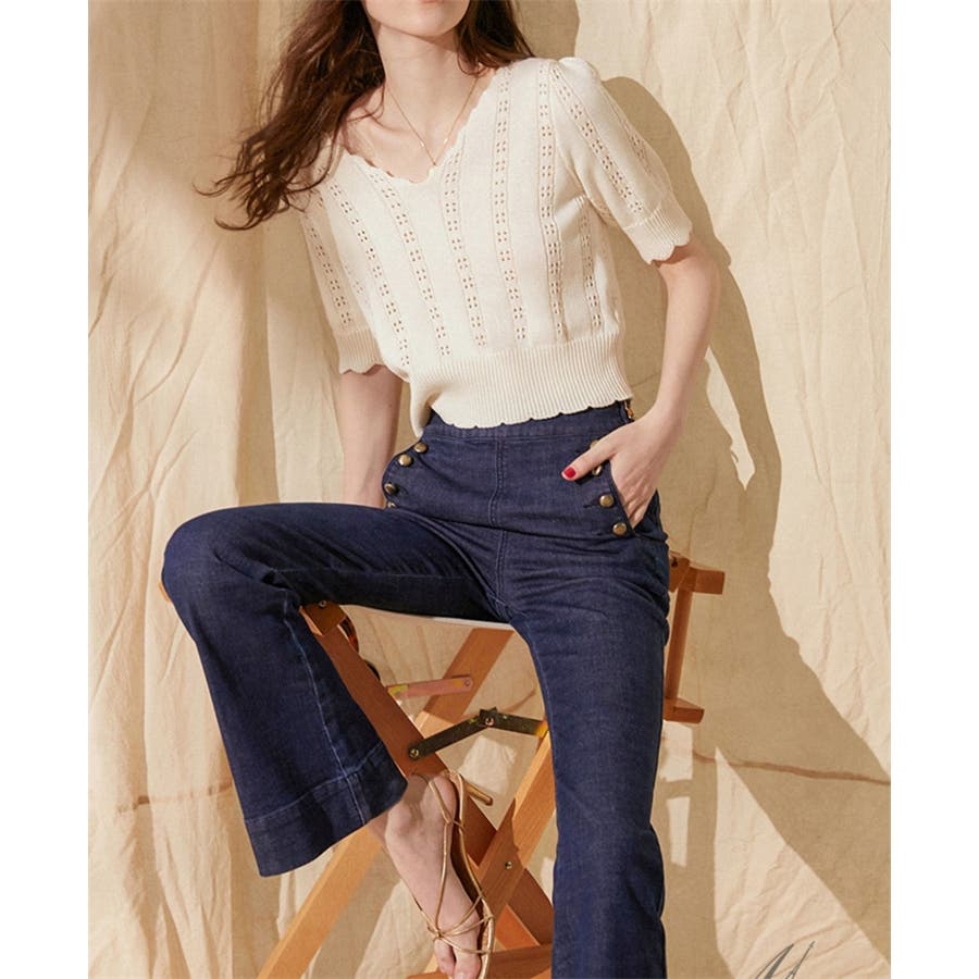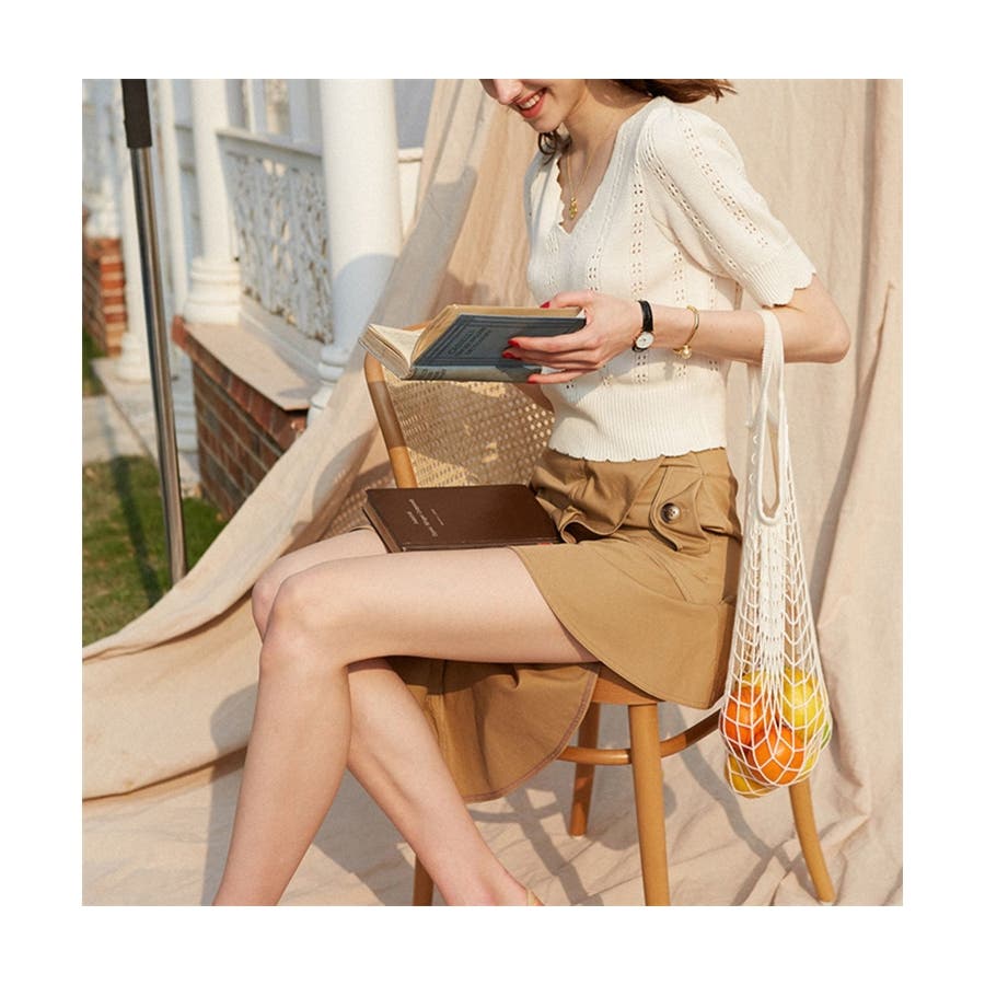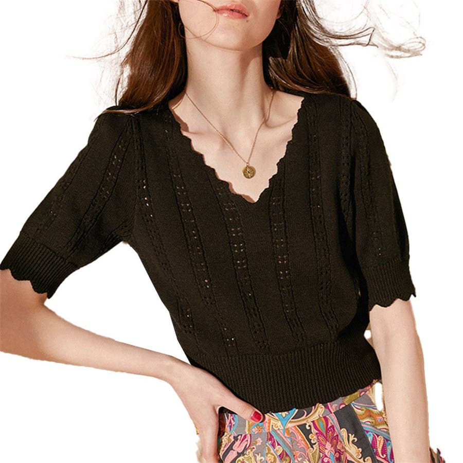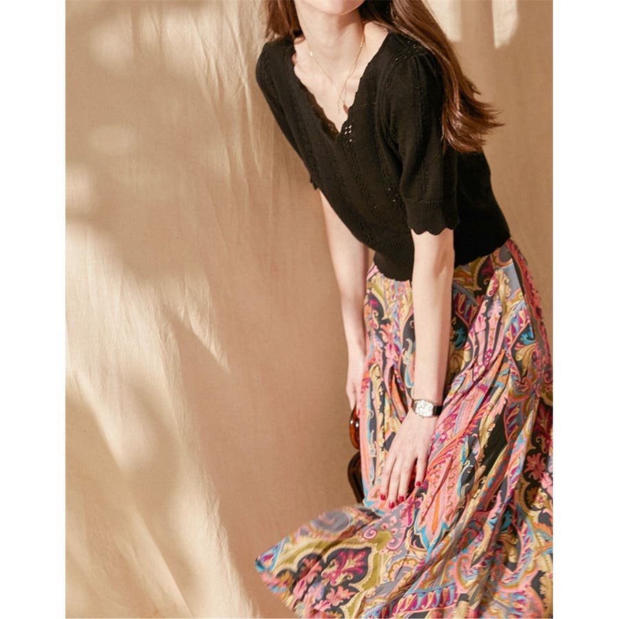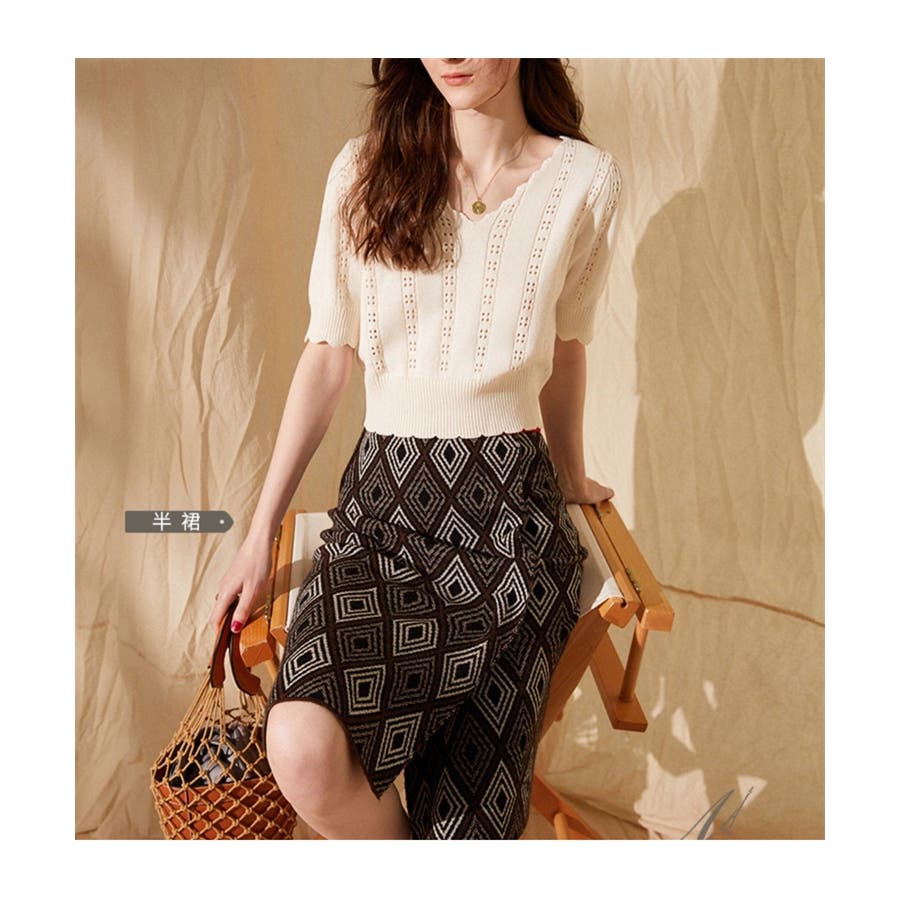 透かし編み 五分袖ニットトップス品の良さと女らしさを演出できる繊細な透かし編みの五分袖ニットトップス。