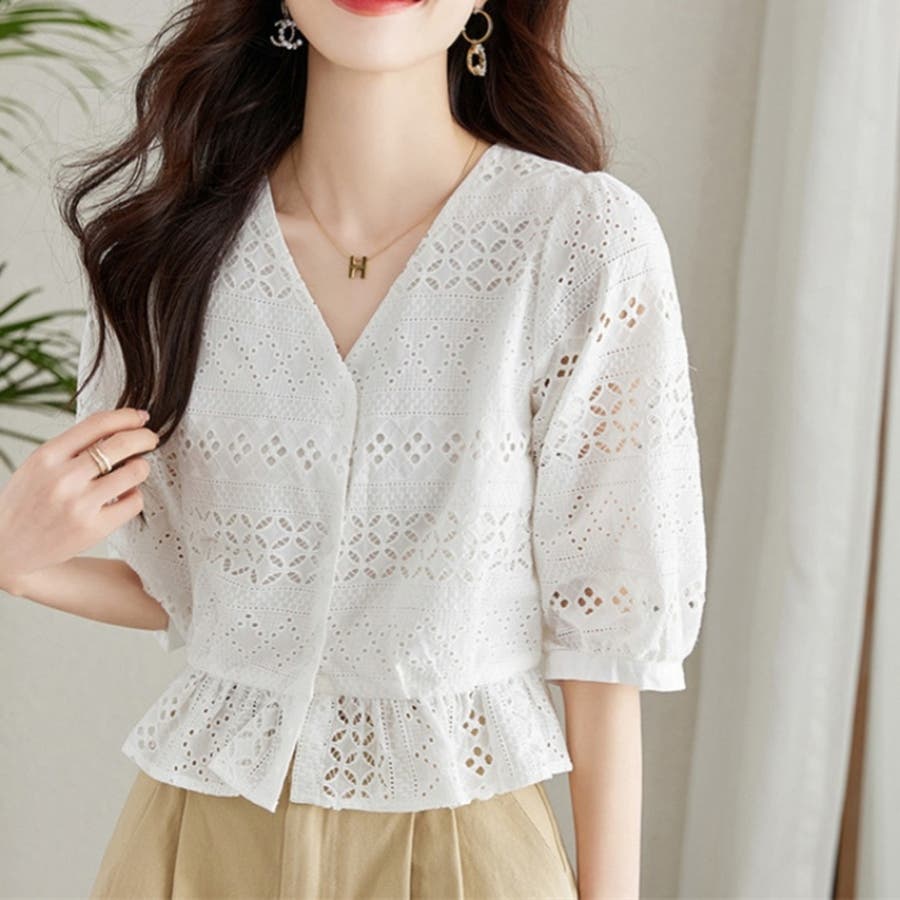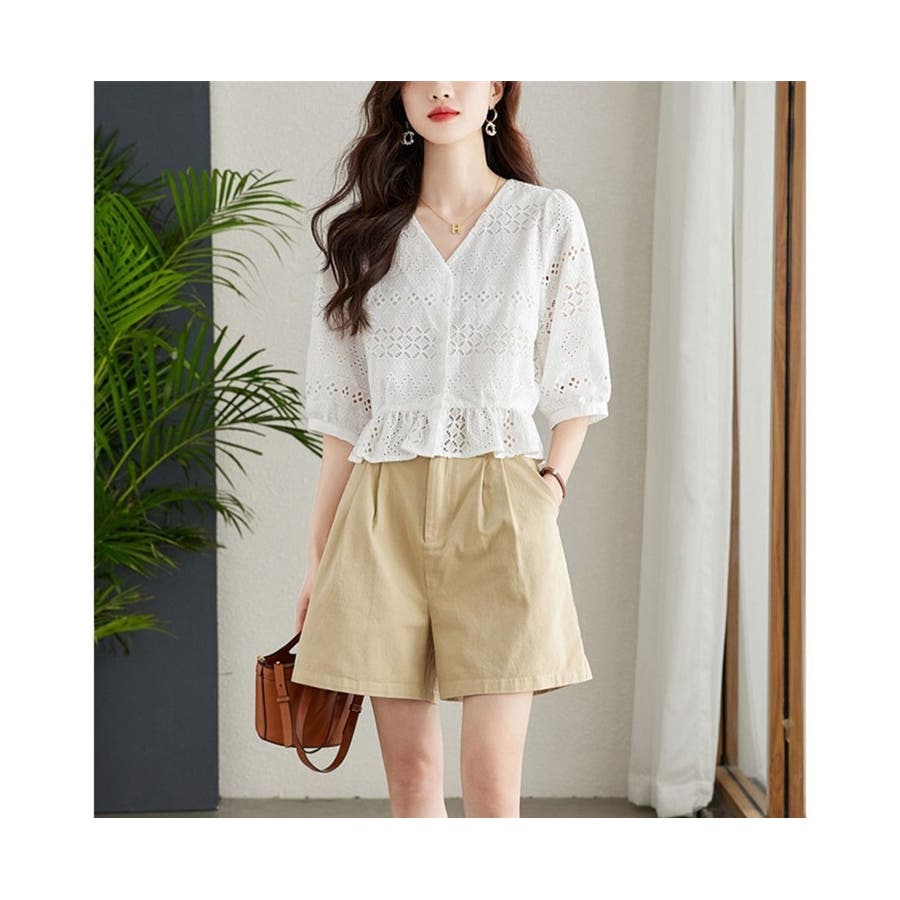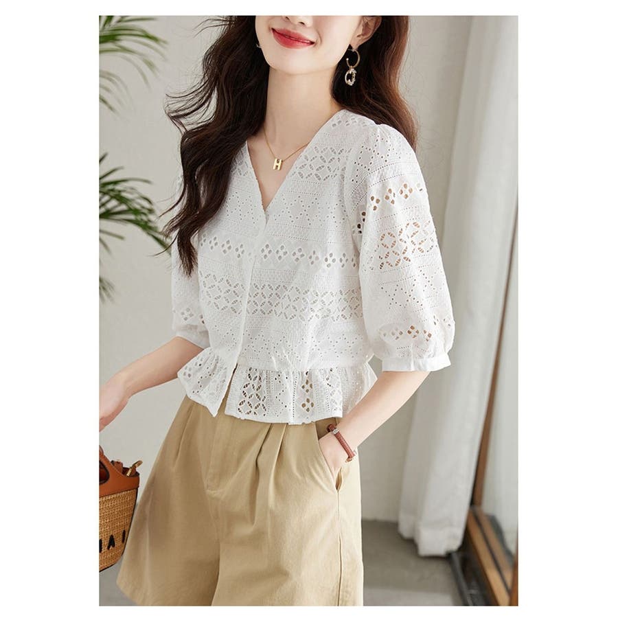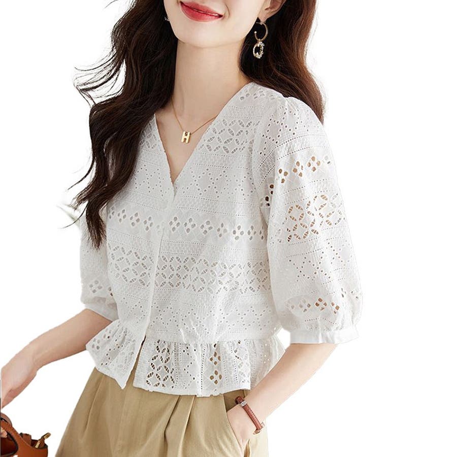 夏季レースブラウスは、涼しげなデザインと女性らしいシルエットが魅力的なアイテムです。Vネックと五分袖の組み合わせが、洗練された印象を与え、どんなシーンでも活躍します。特に、ペプラムトップスのウエストマークはスタイルアップ効果も期待でき、パンチングレースの繊細なディテールが上品な雰囲気を演出します。