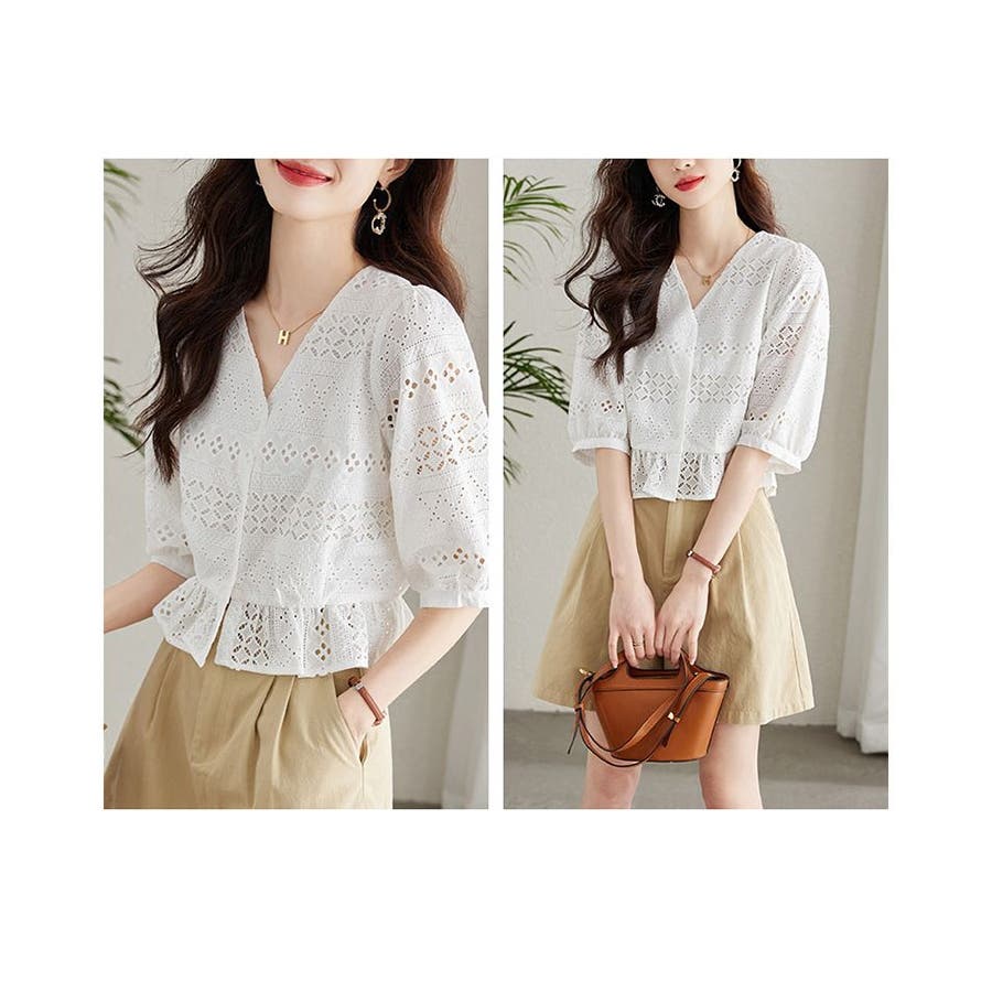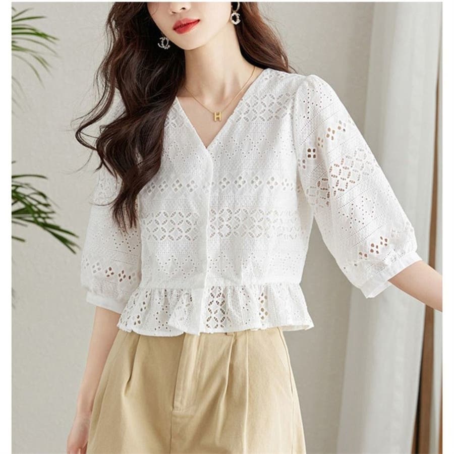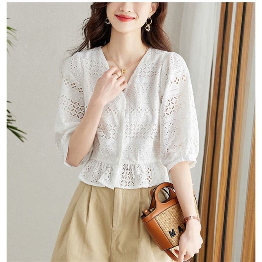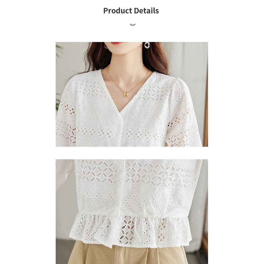 夏季レースブラウスは、涼しげなデザインと女性らしいシルエットが魅力的なアイテムです。Vネックと五分袖の組み合わせが、洗練された印象を与え、どんなシーンでも活躍します。特に、ペプラムトップスのウエストマークはスタイルアップ効果も期待でき、パンチングレースの繊細なディテールが上品な雰囲気を演出します。