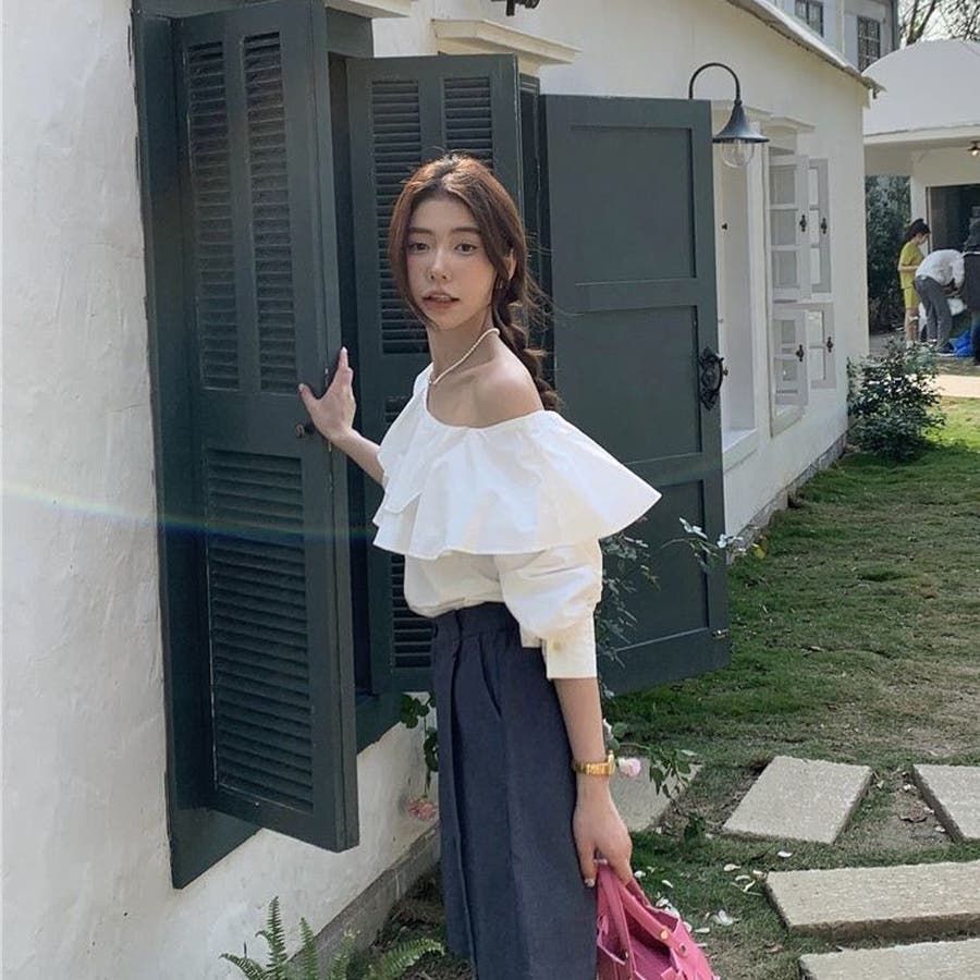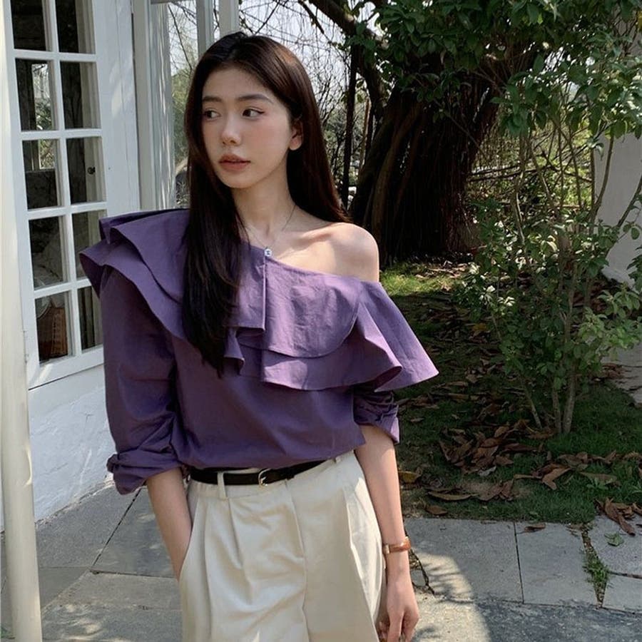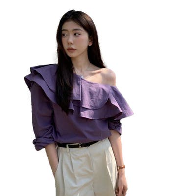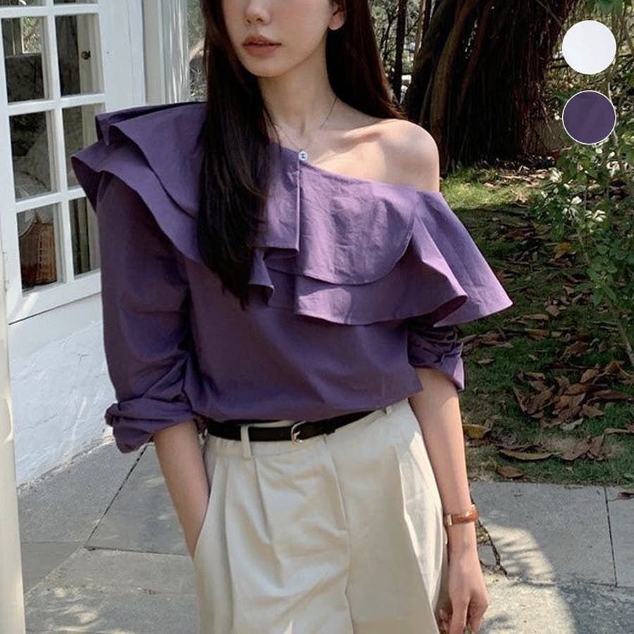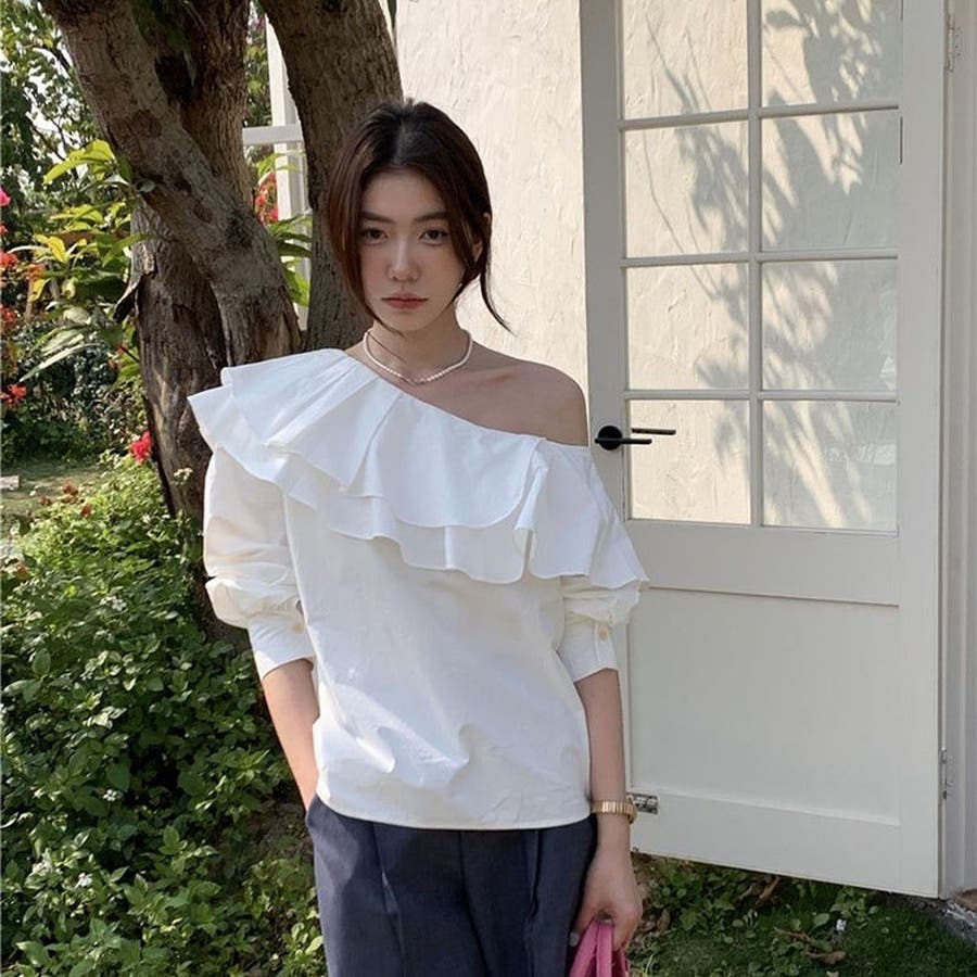 片側に大きく入ったフリルが女性らしい華やかさを演出し、着るだけでコーディネートの主役に。