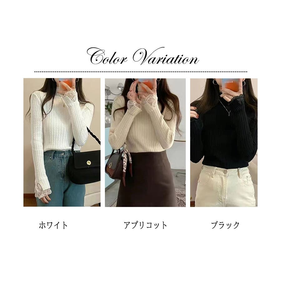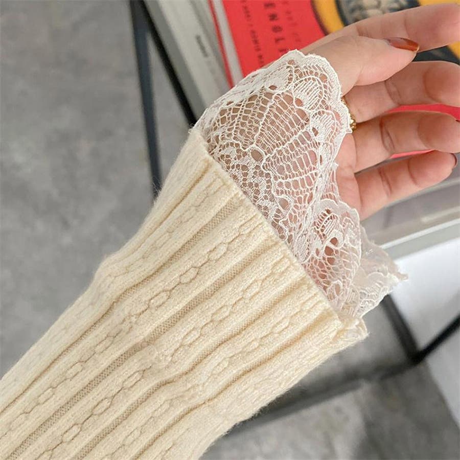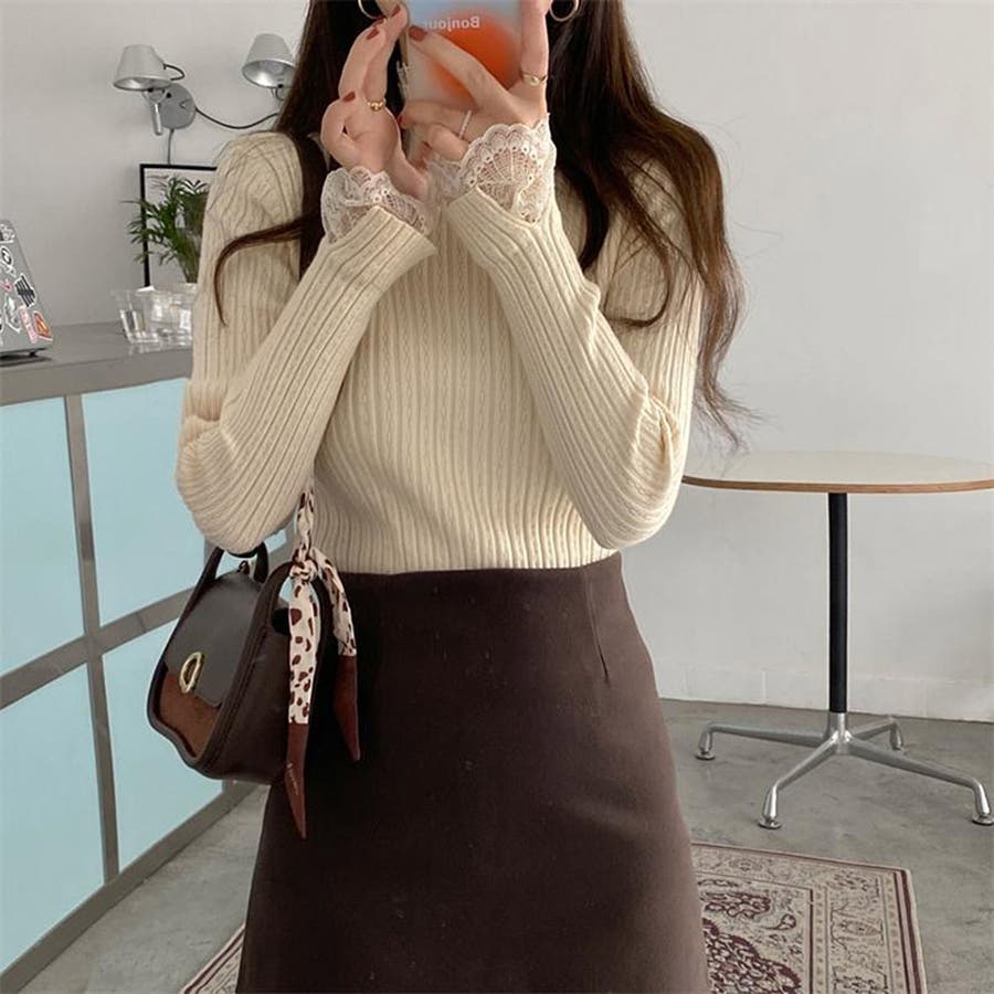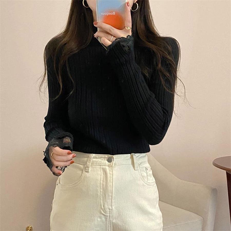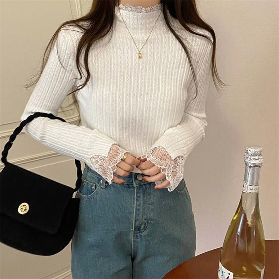 レースのディテールが施されたデザインは、シンプルでありながらもお洒落な印象を与えます。長袖で暖かく、カジュアルからきれいめまで幅広いコーディネートに対応可能です。