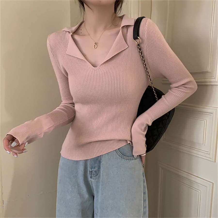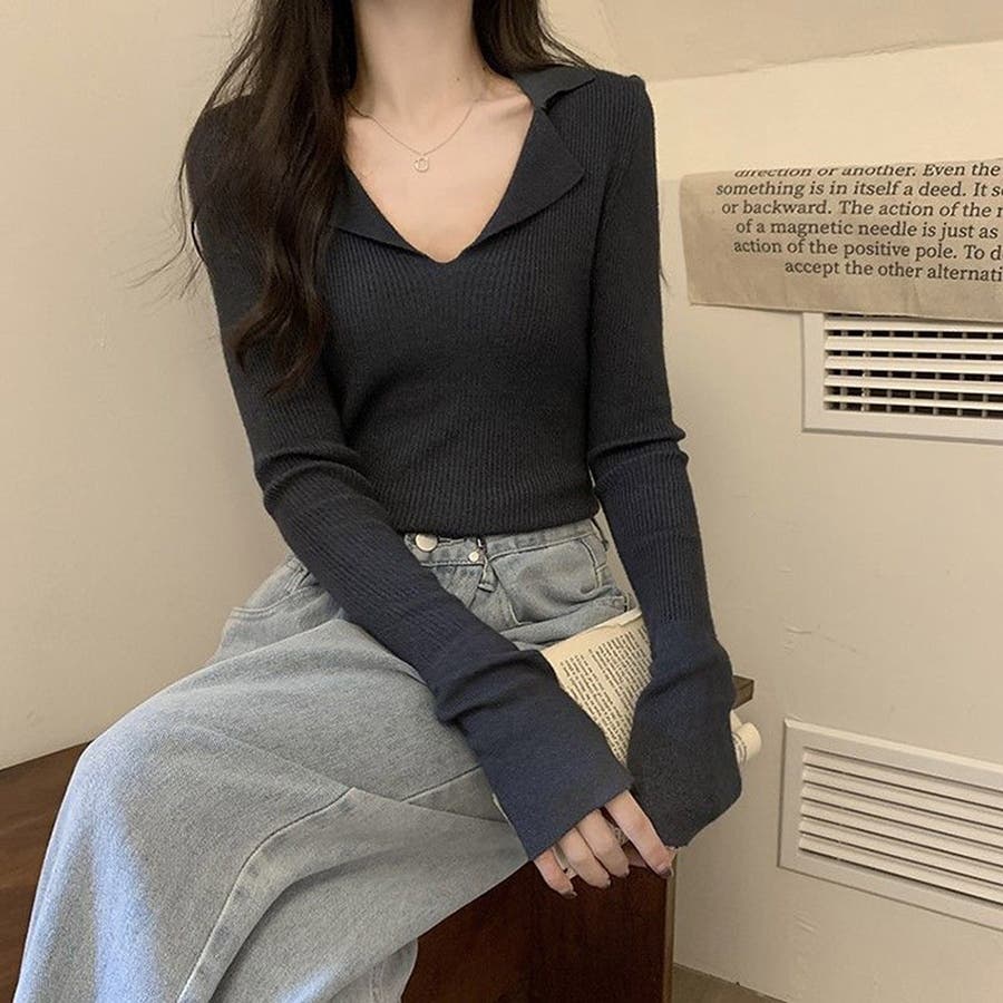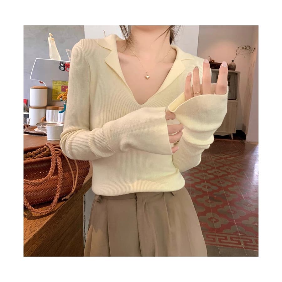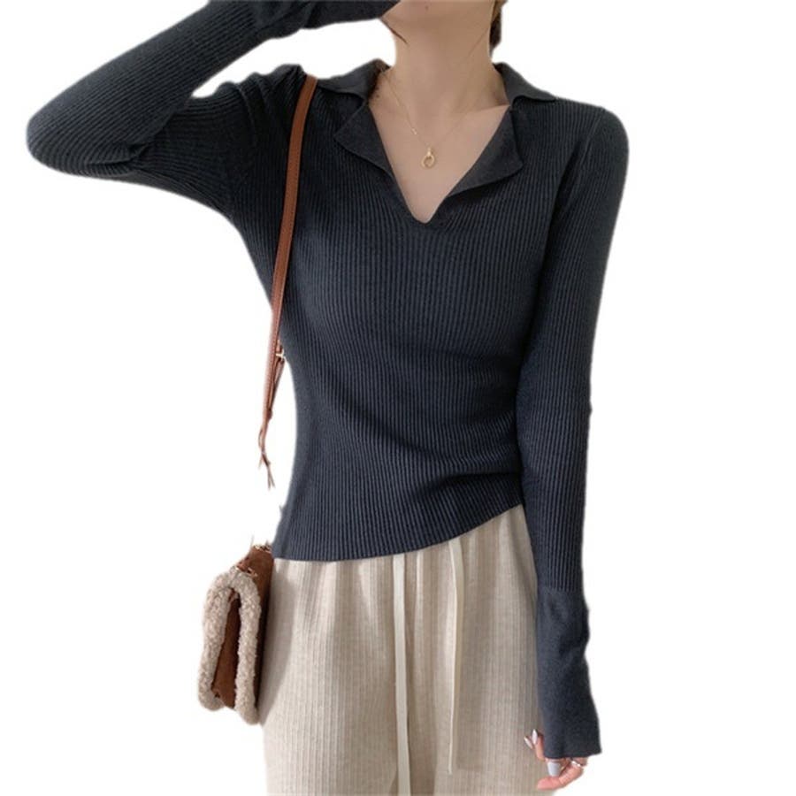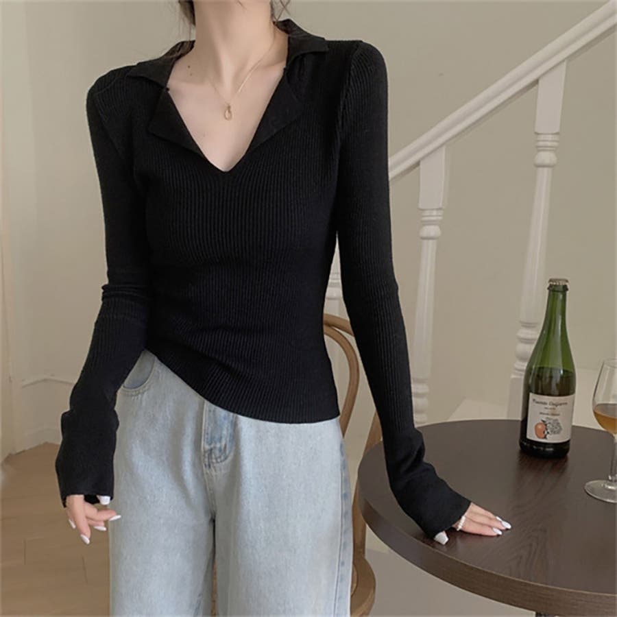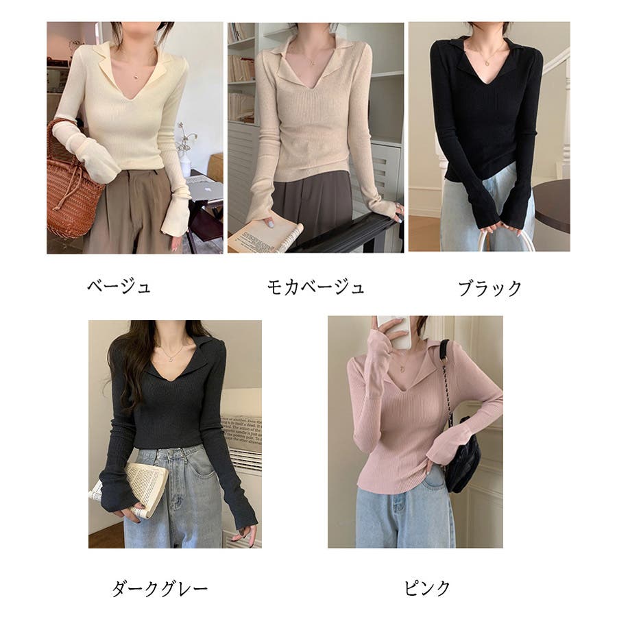 無地でシンプルながら、Vネックデザインがデコルテをきれいに見せ、カジュアルの中にも女性らしさを演出します。