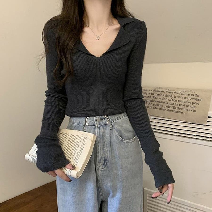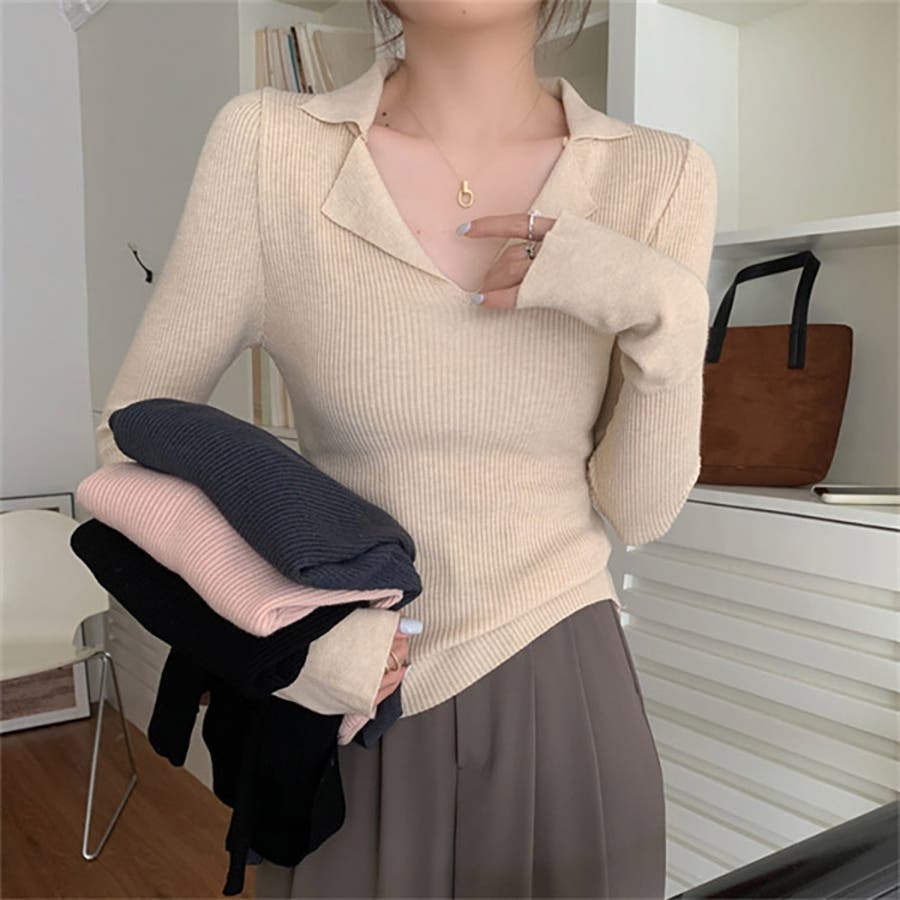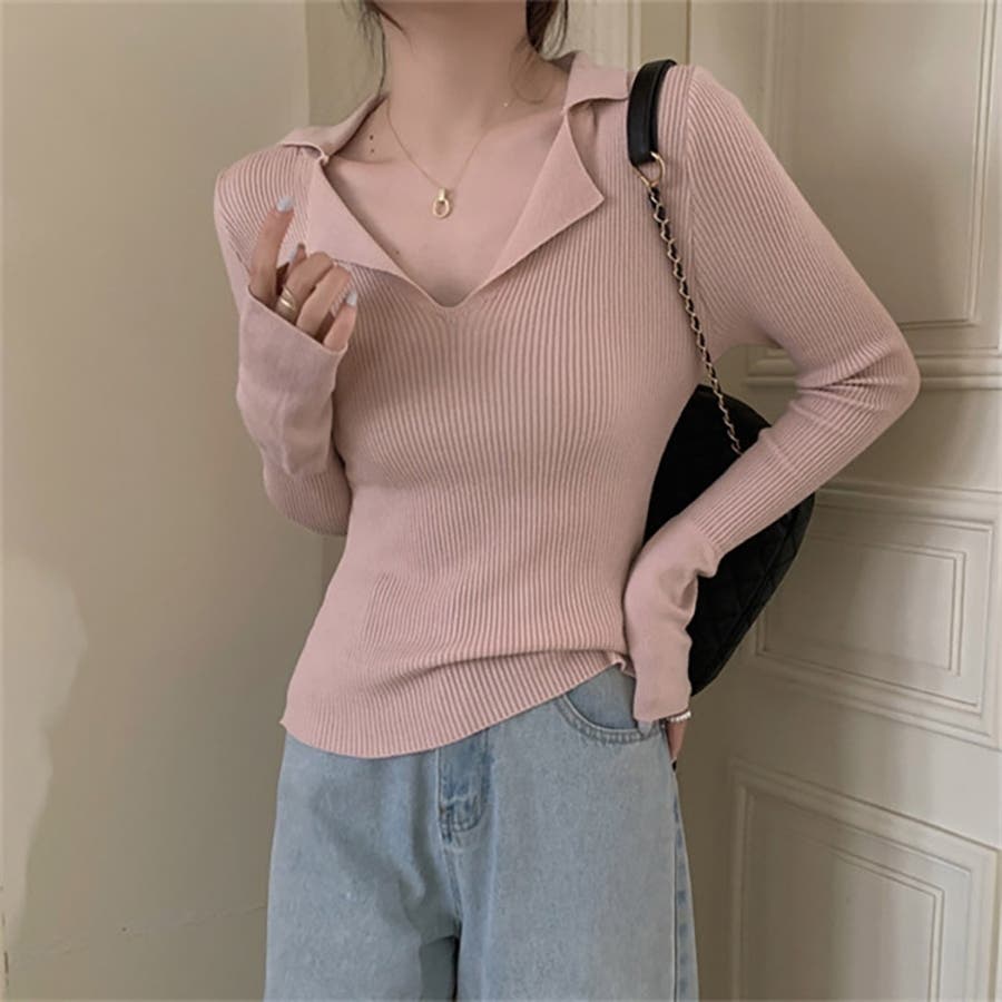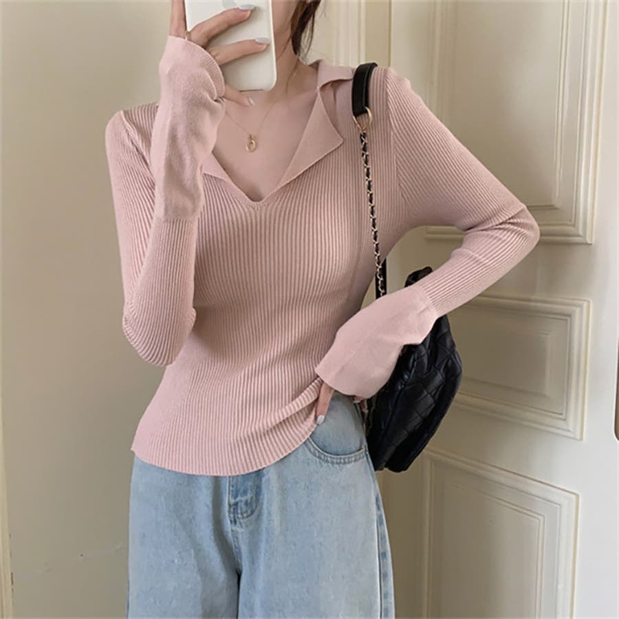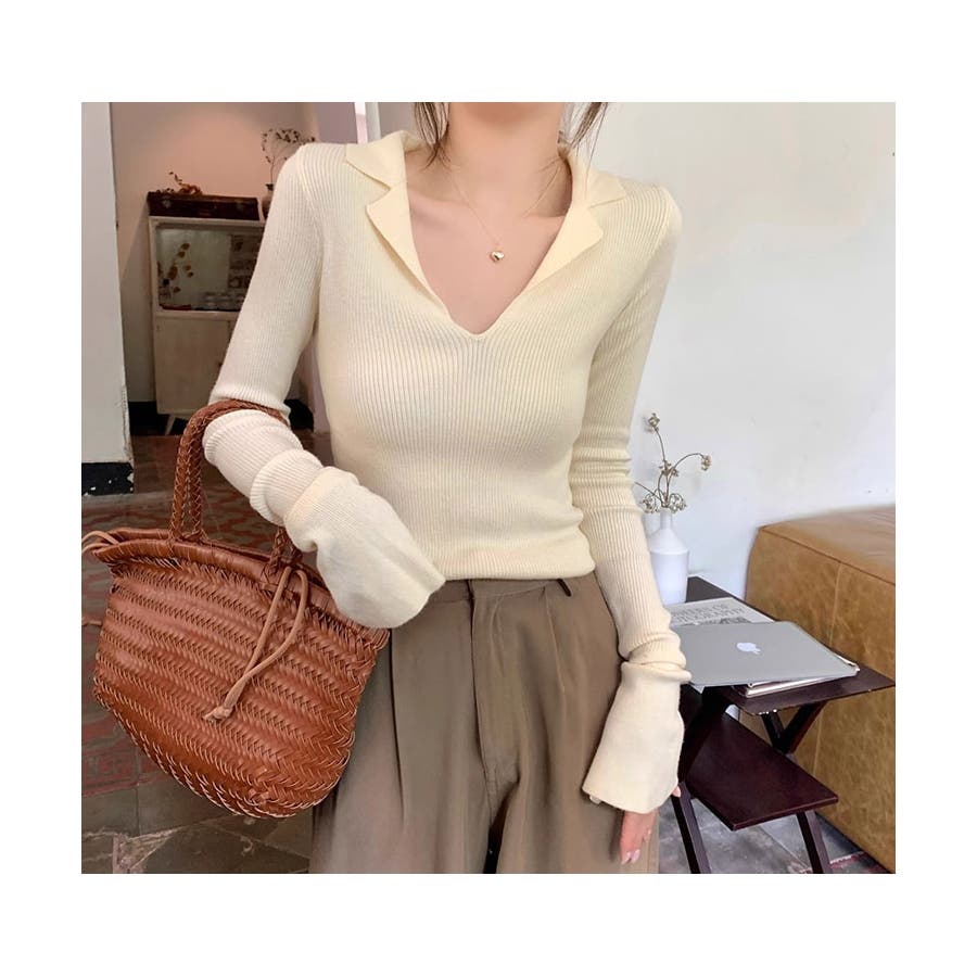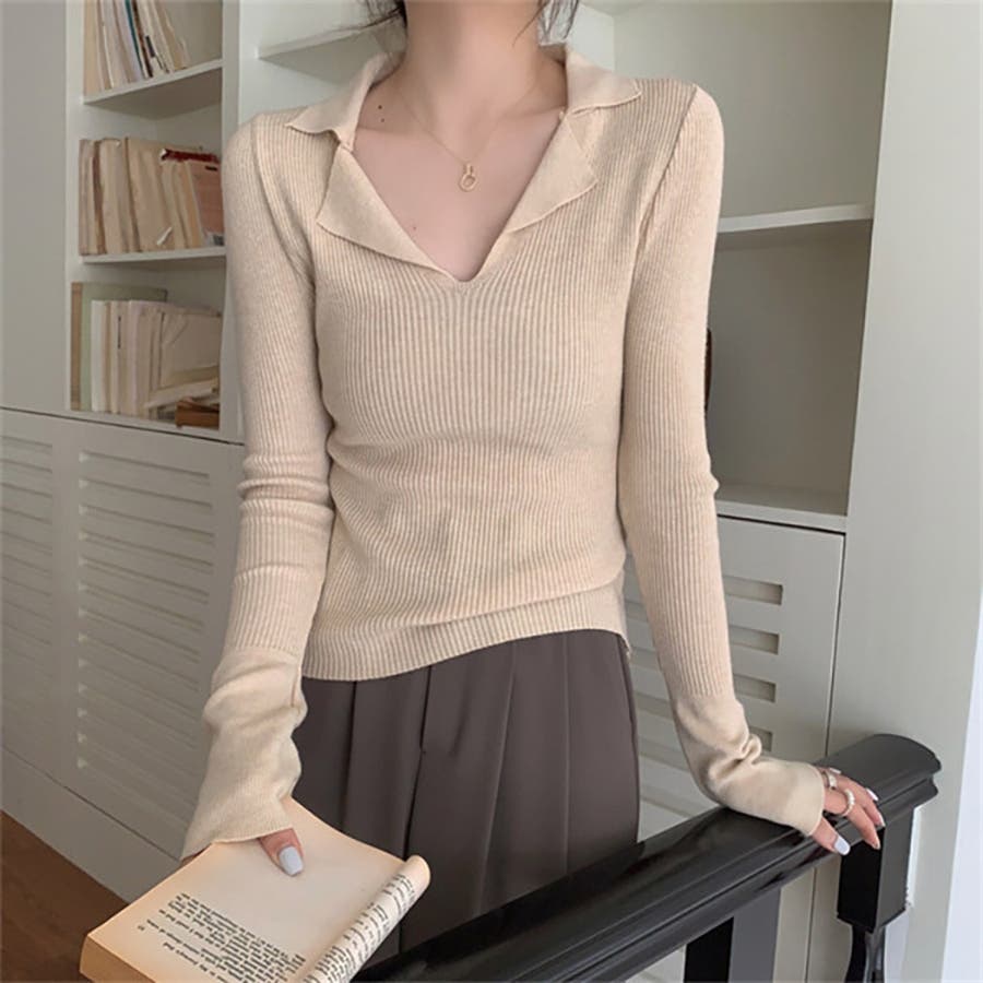 無地でシンプルながら、Vネックデザインがデコルテをきれいに見せ、カジュアルの中にも女性らしさを演出します。