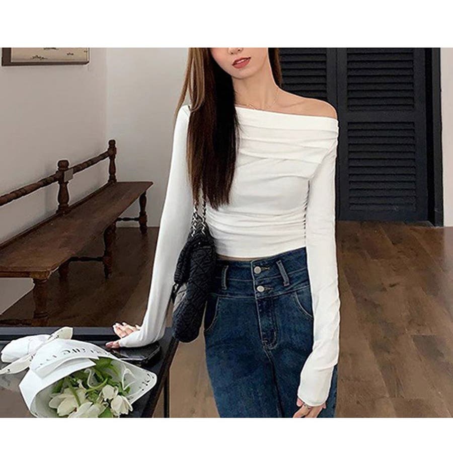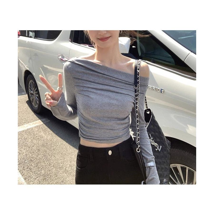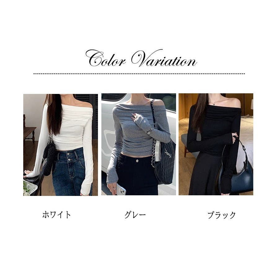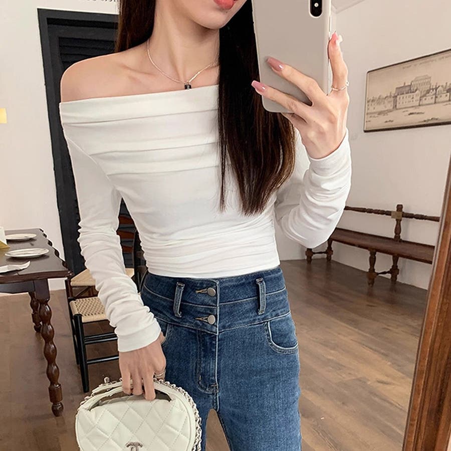 女性らしさを引き立てる、オフショルダーTシャツ。胸元に施されたさりげないギャザー加工が、シンプルながらも上品なアクセントに。ボディラインに程よくフィットするシルエットで、スタイルアップ効果も抜群。