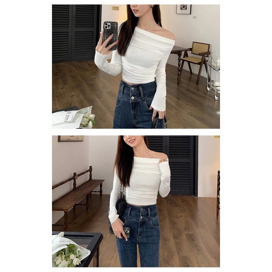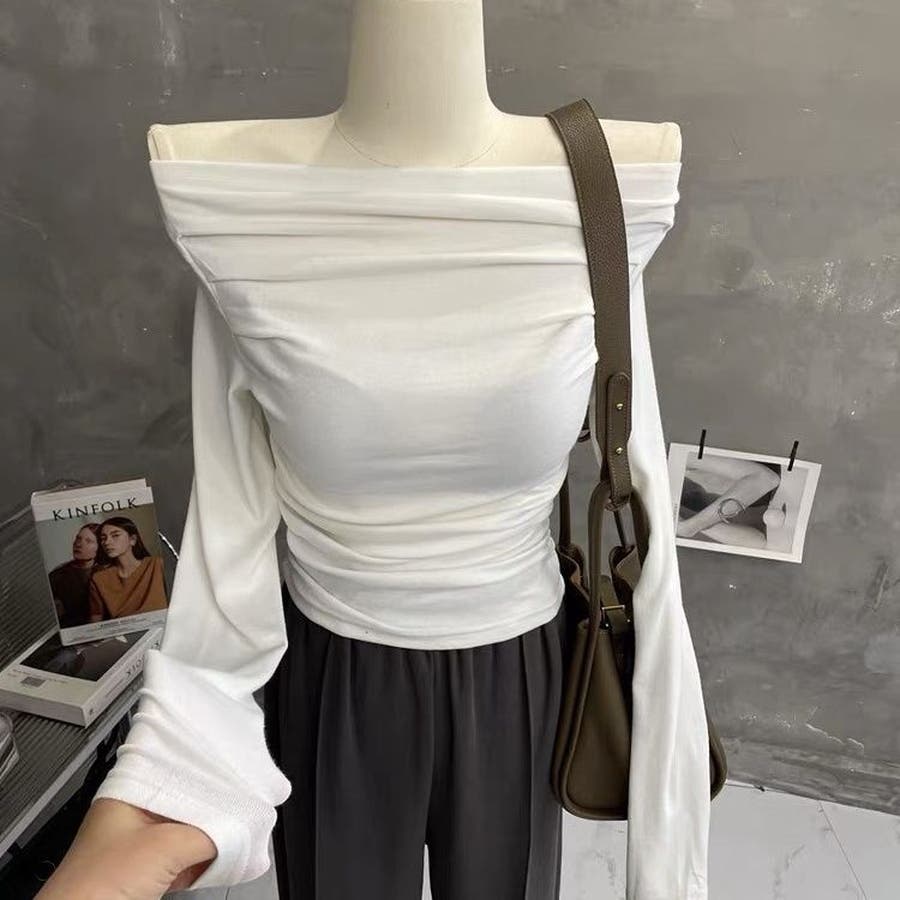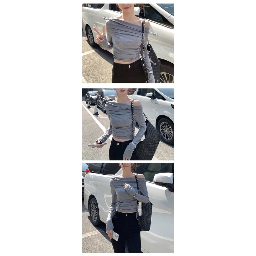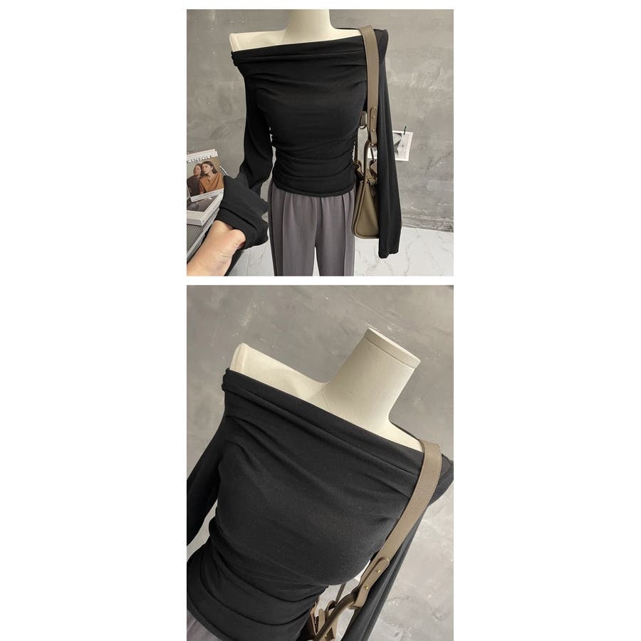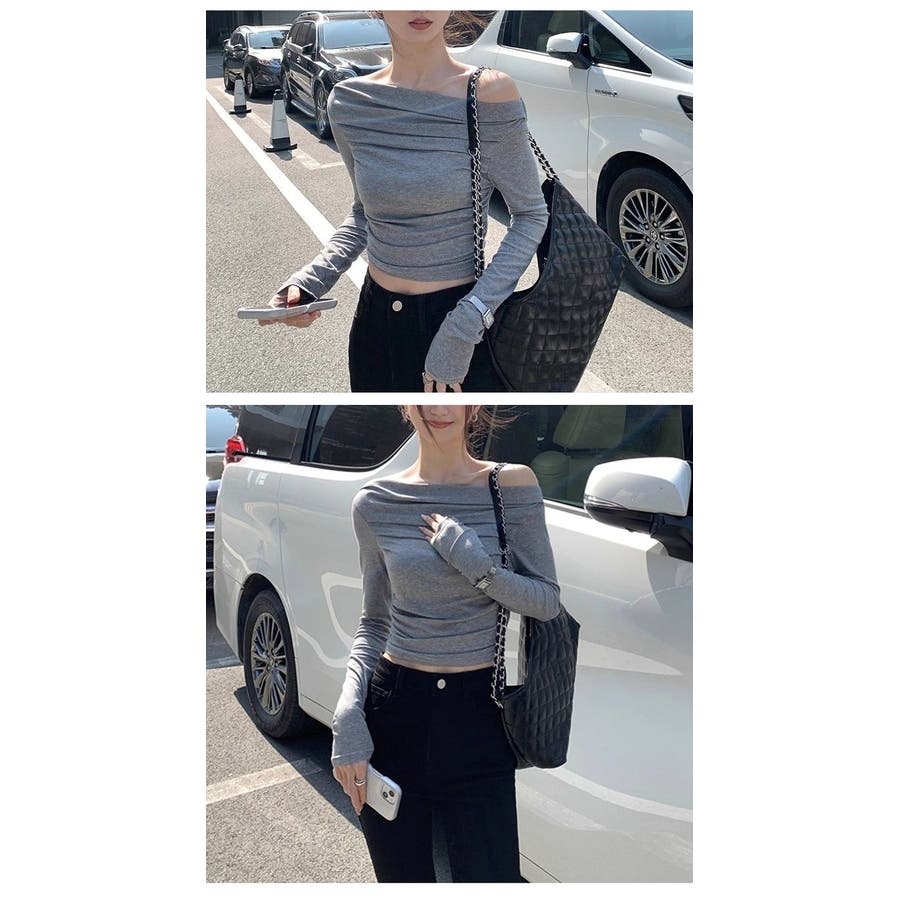 女性らしさを引き立てる、オフショルダーTシャツ。胸元に施されたさりげないギャザー加工が、シンプルながらも上品なアクセントに。ボディラインに程よくフィットするシルエットで、スタイルアップ効果も抜群。