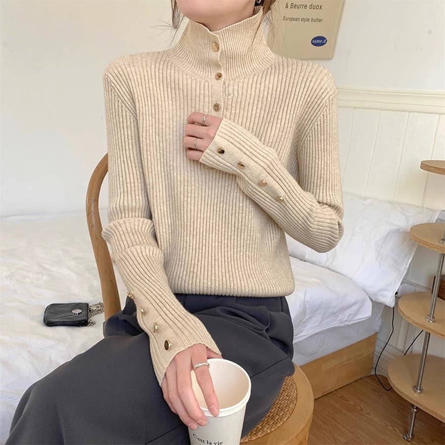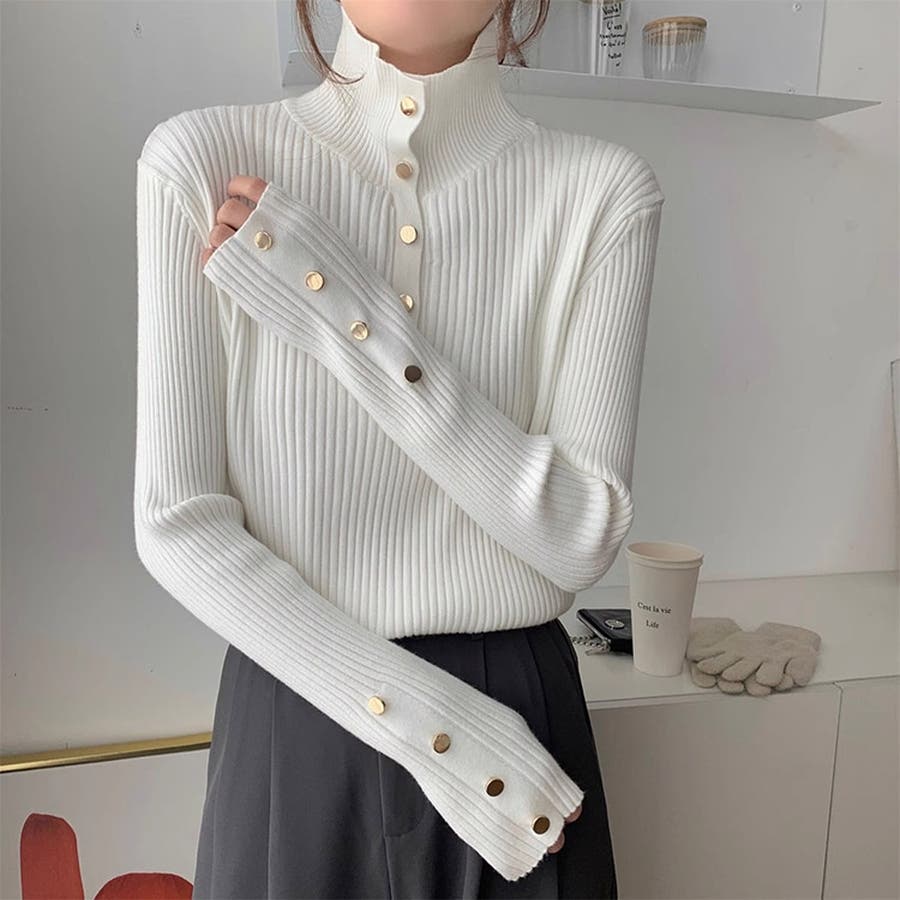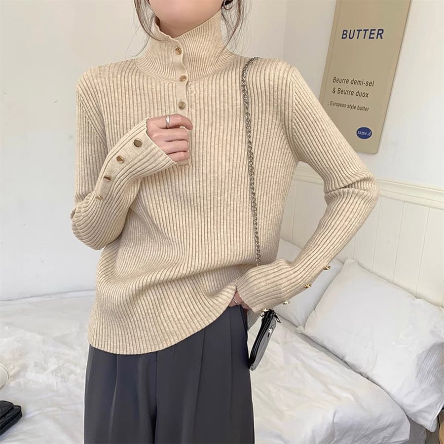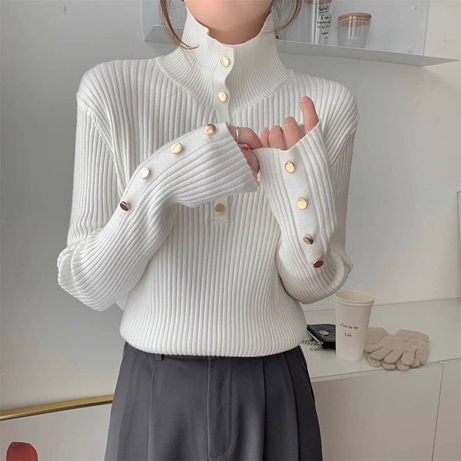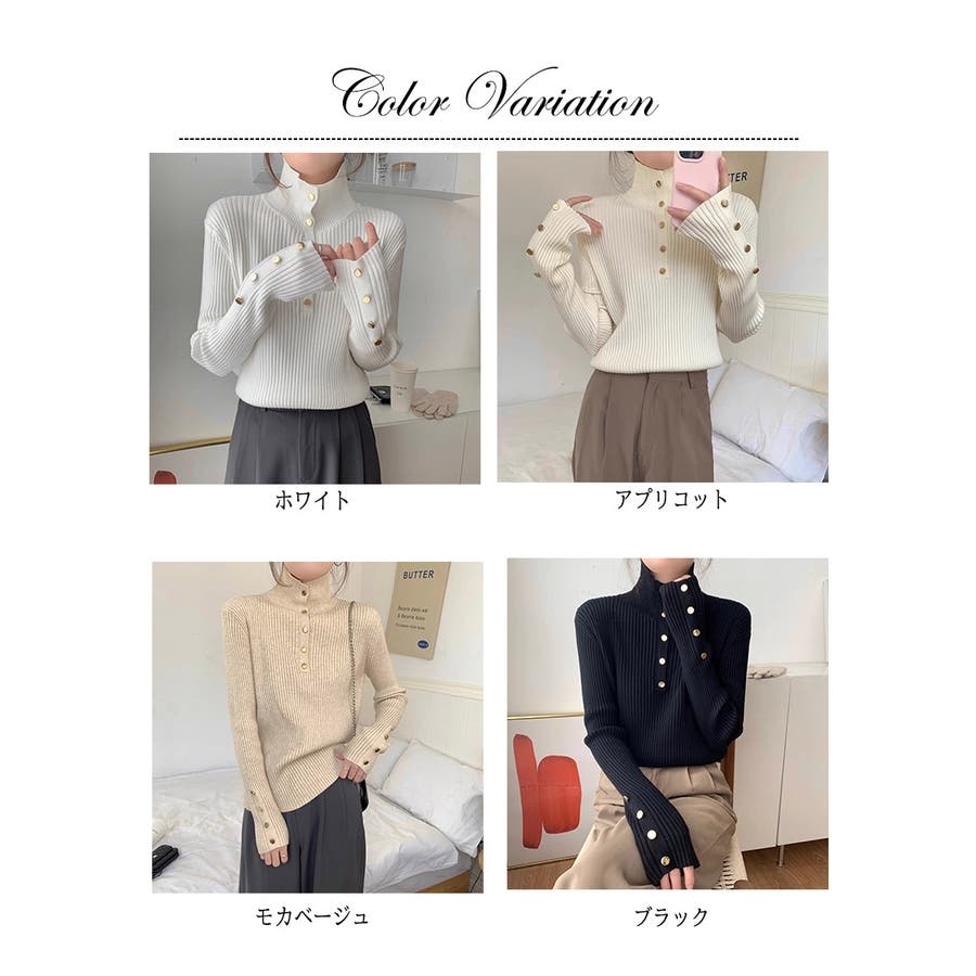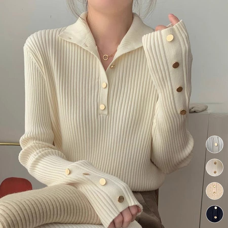 リブニット レディース トップス 袖ボタン 長袖 オフィス