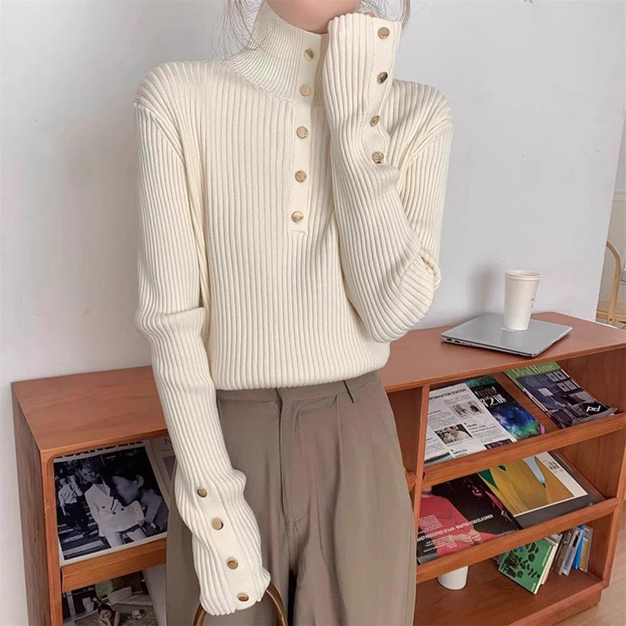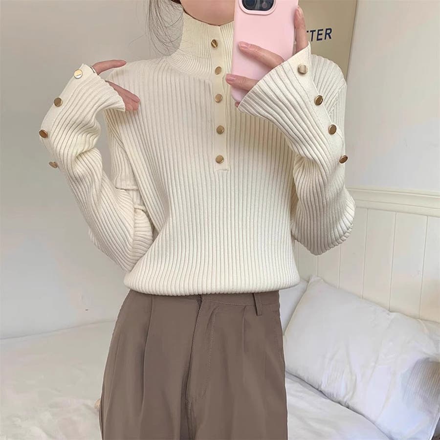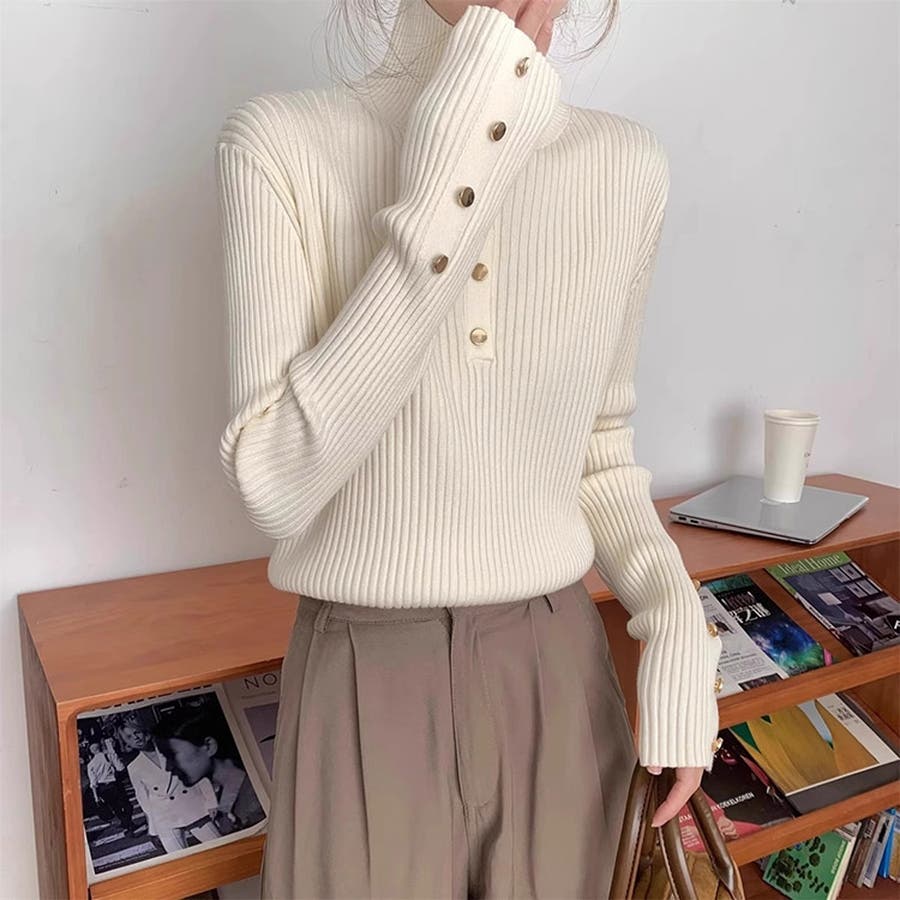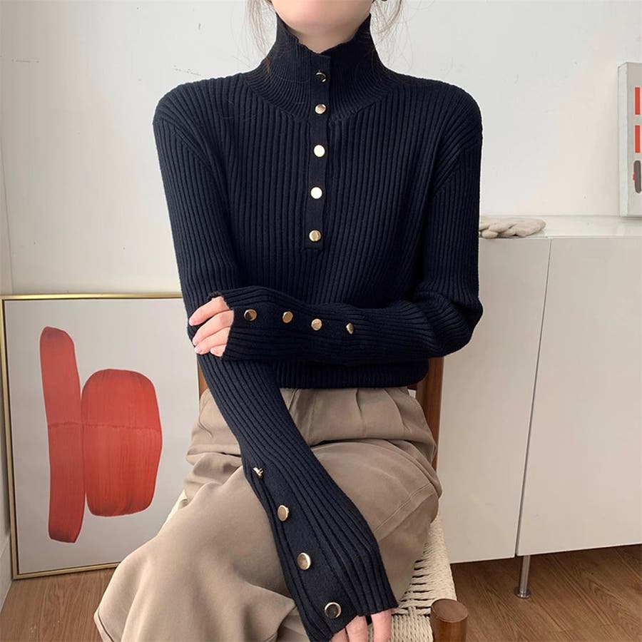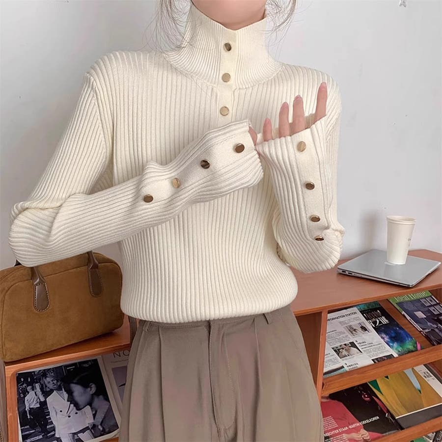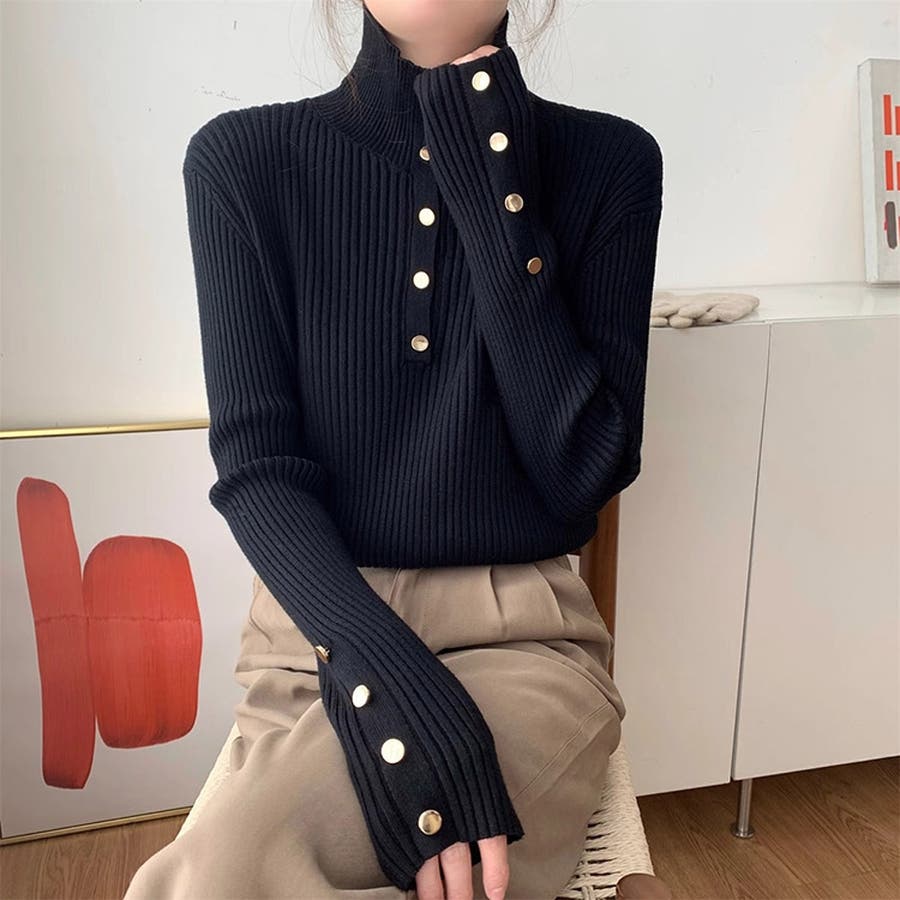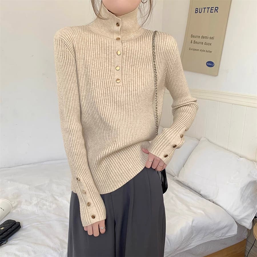 リブニット レディース トップス 袖ボタン 長袖 オフィス