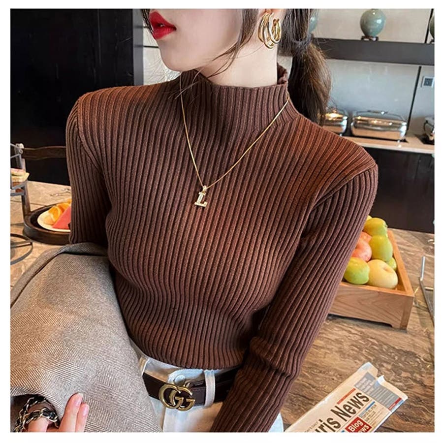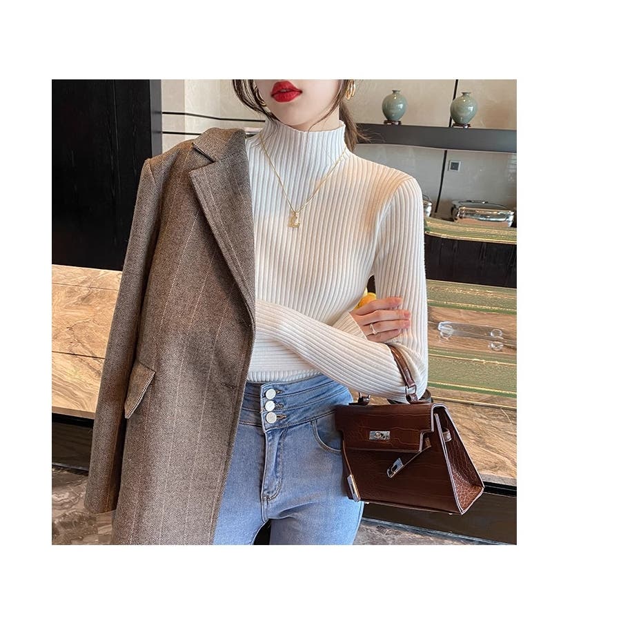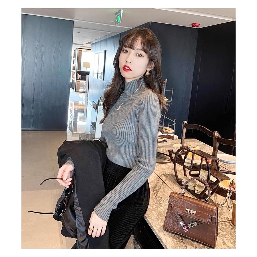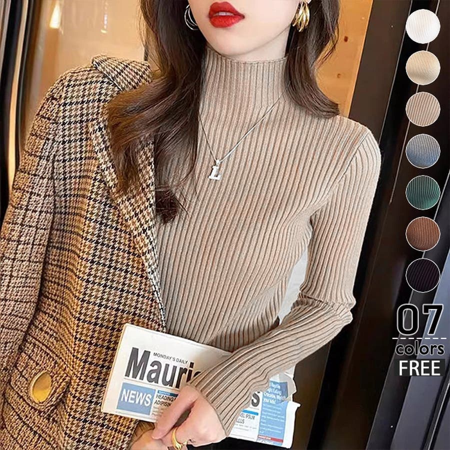 上品さと女性らしさを引き立てるリブ編みハイネックニットトップス。