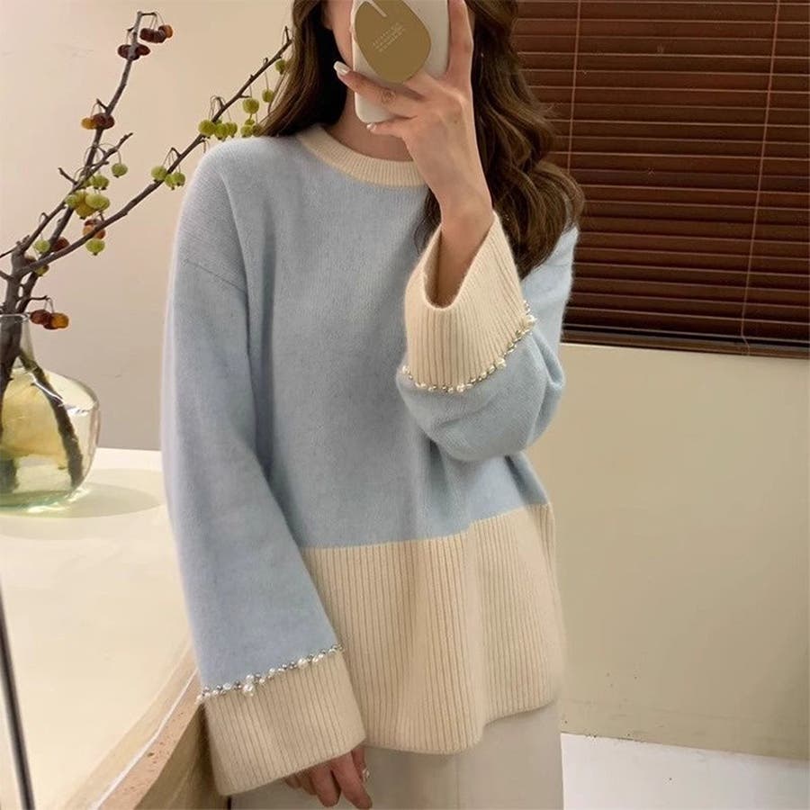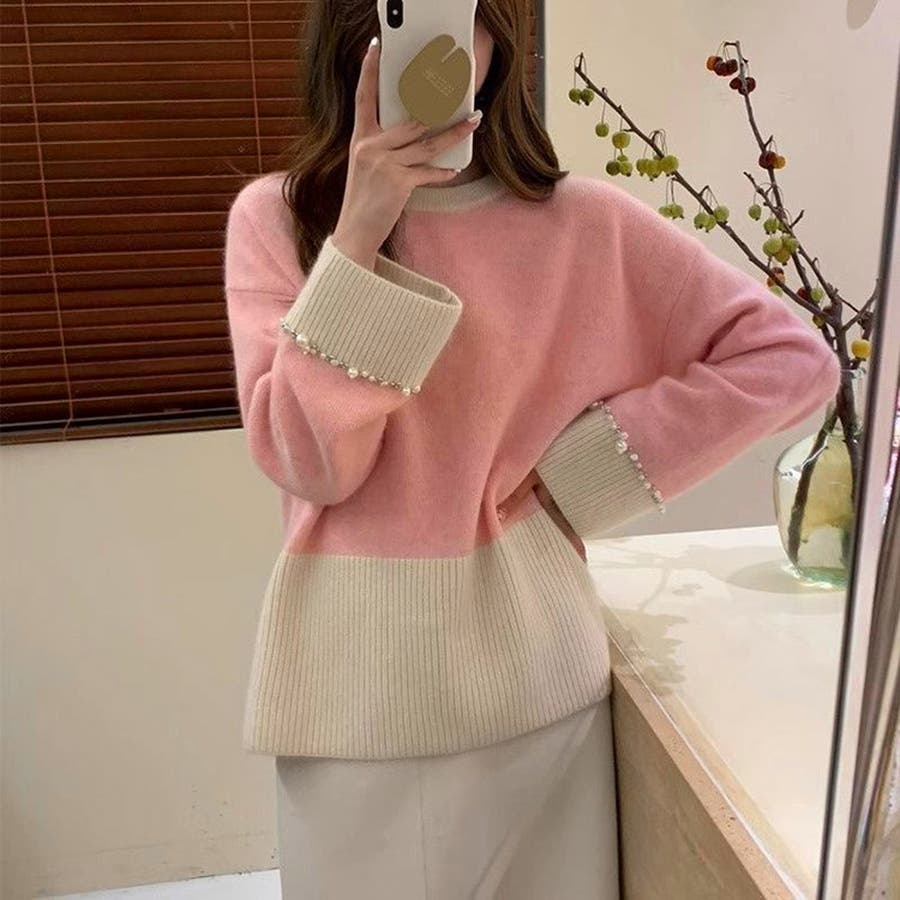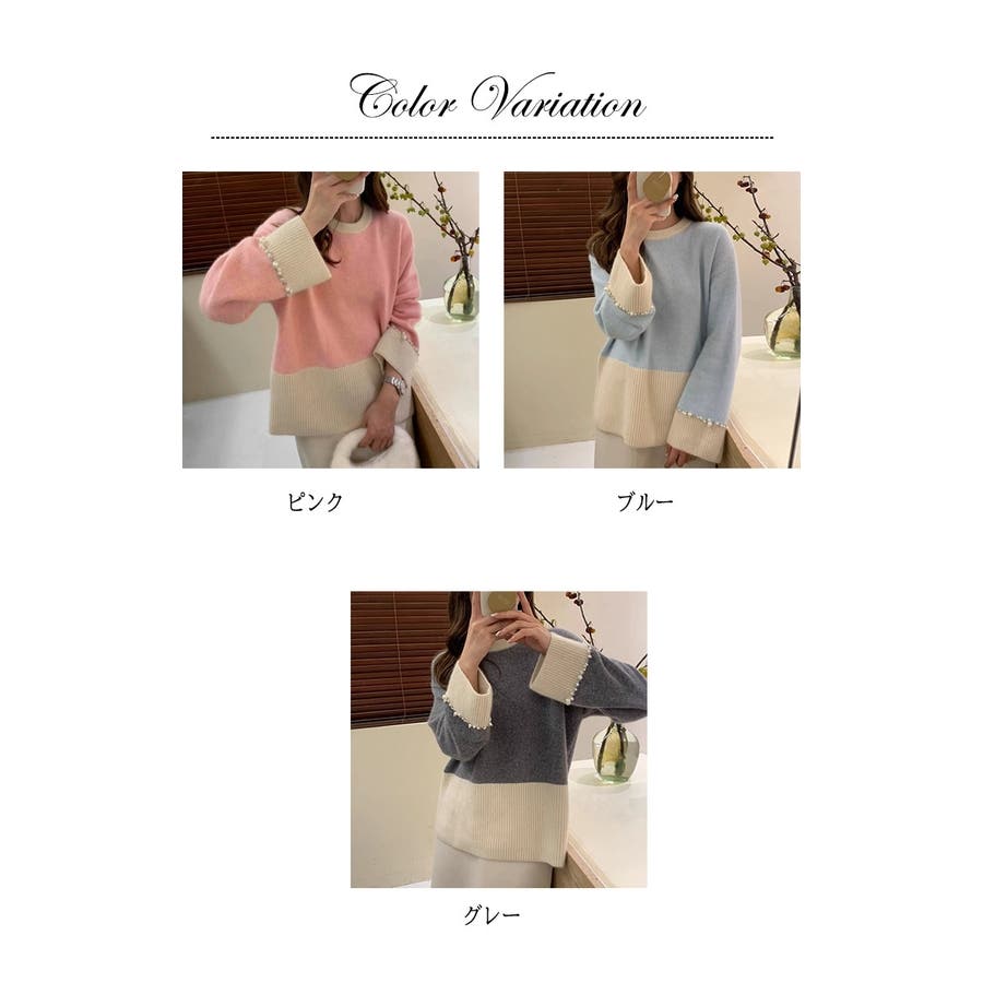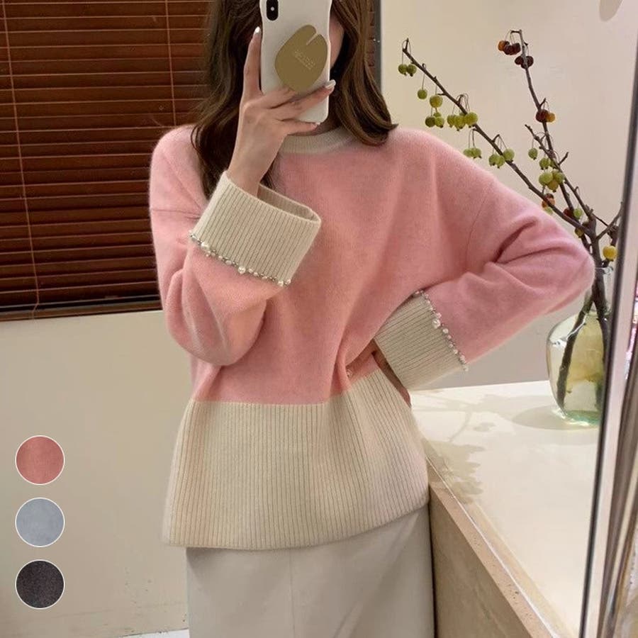 この配色ニットは、春の新作として登場し、長袖のワイドデザインが特徴です。
