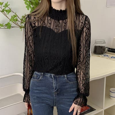ハイネックと長袖のスタイルが、エレガントな印象を与えます。上半身と腕に施された透明なレースデザインは、女性らしさを引き立て、裏地が付いているため安心して着用できます。