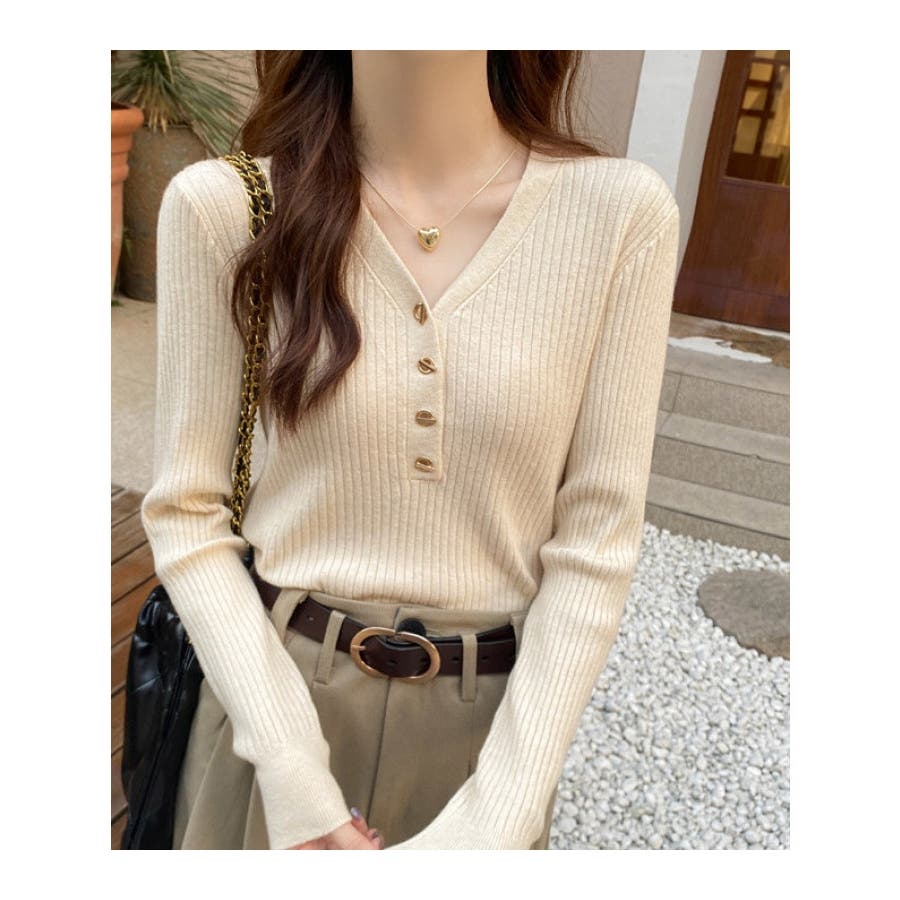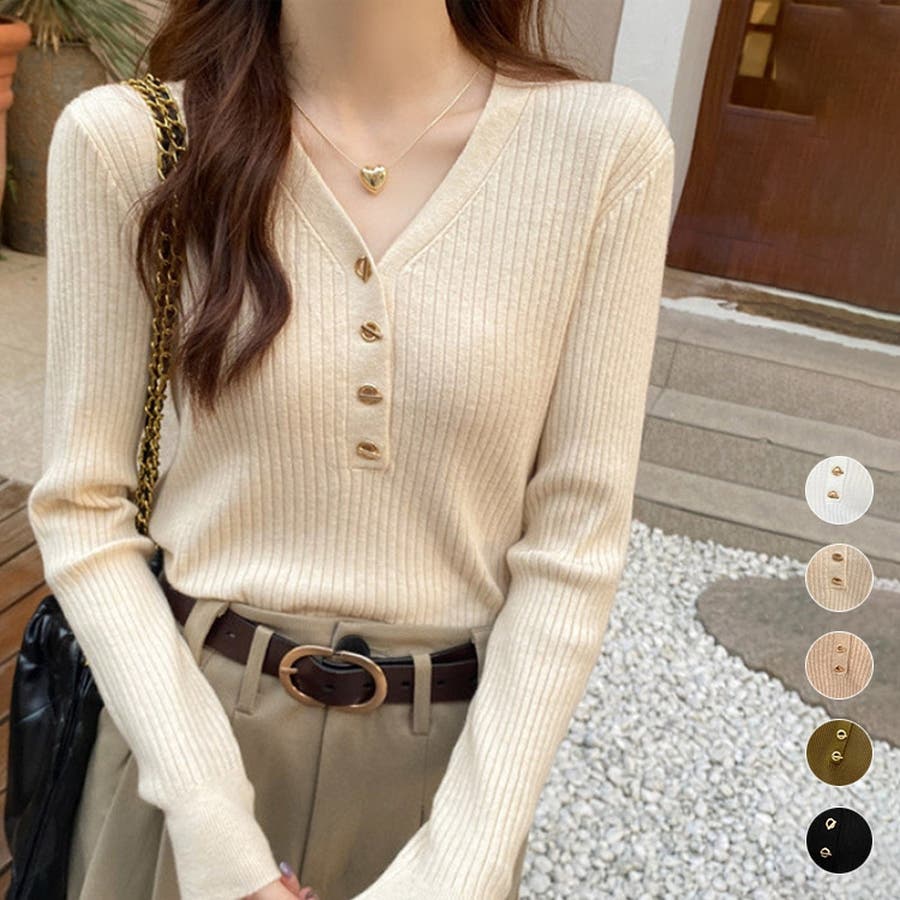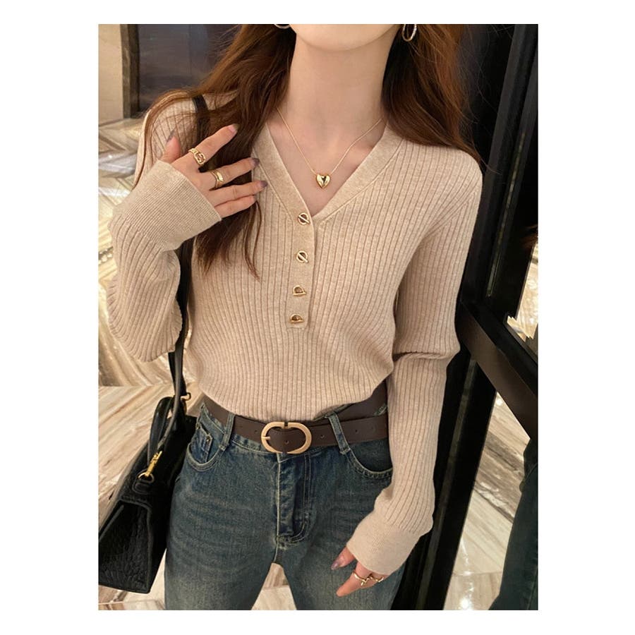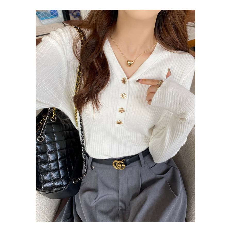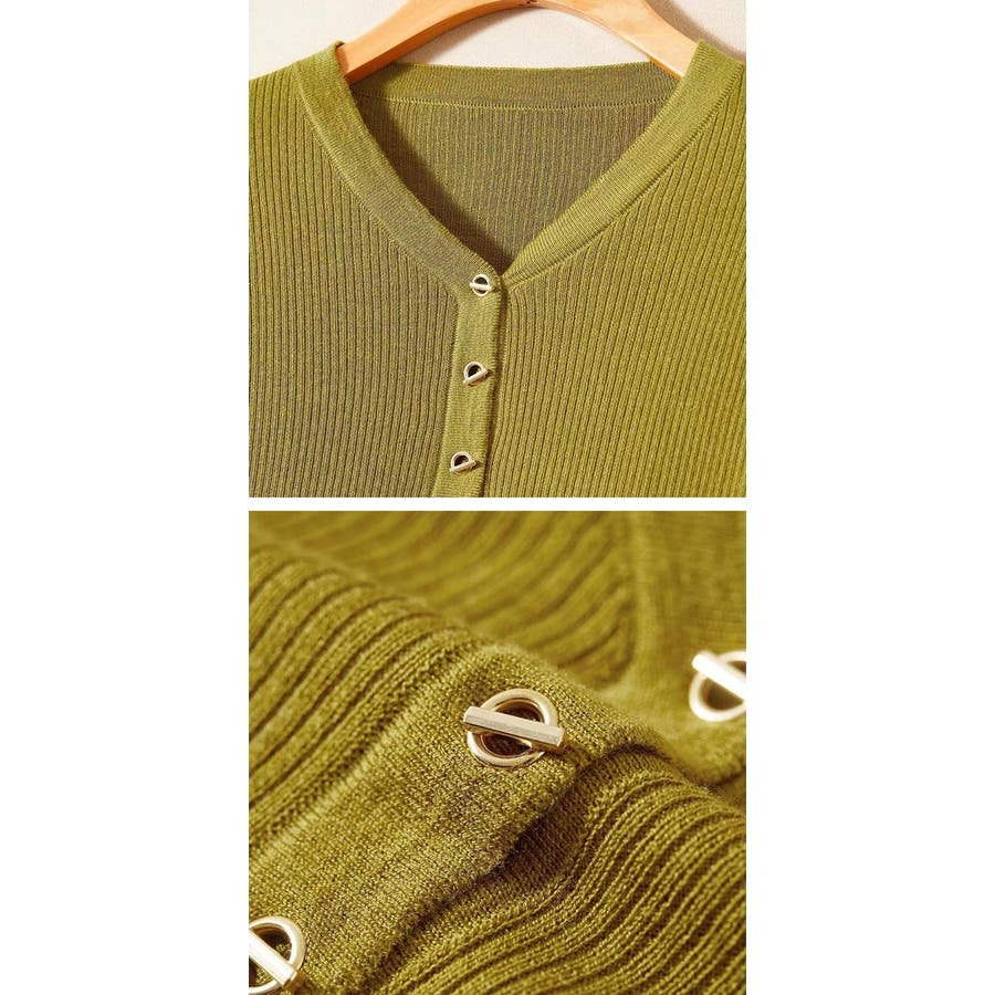 すっきりとしたVネックラインに並んだボタンがアクセントになり、大人の女性らしい抜け感をプラスします。