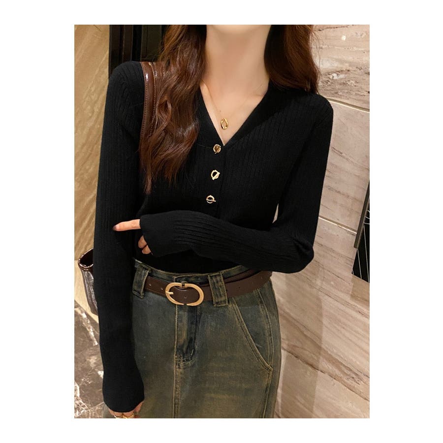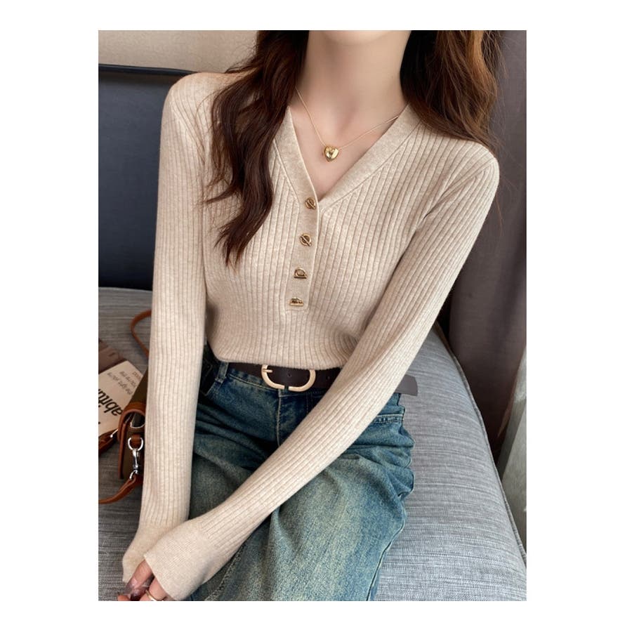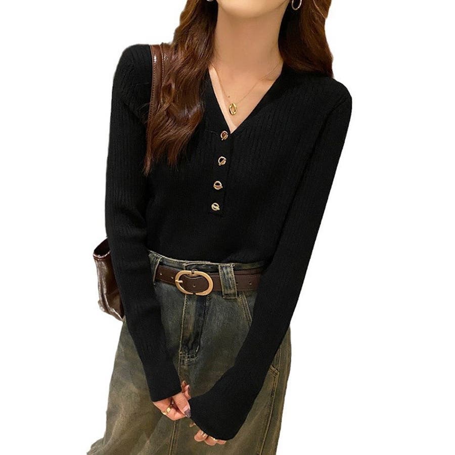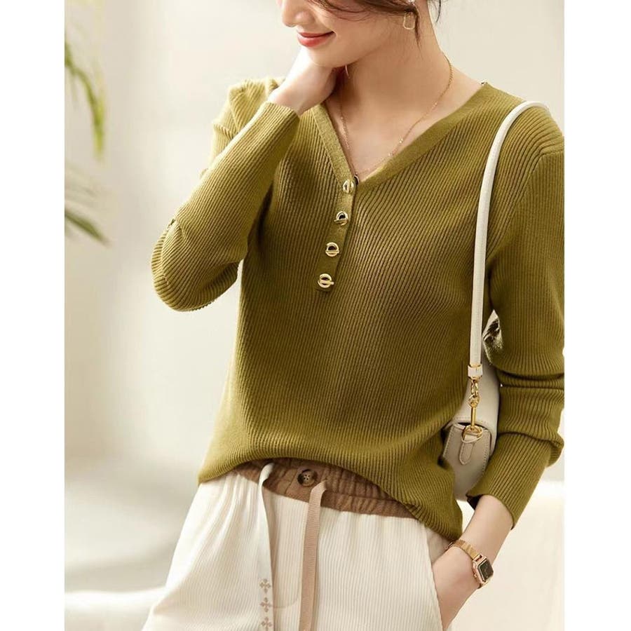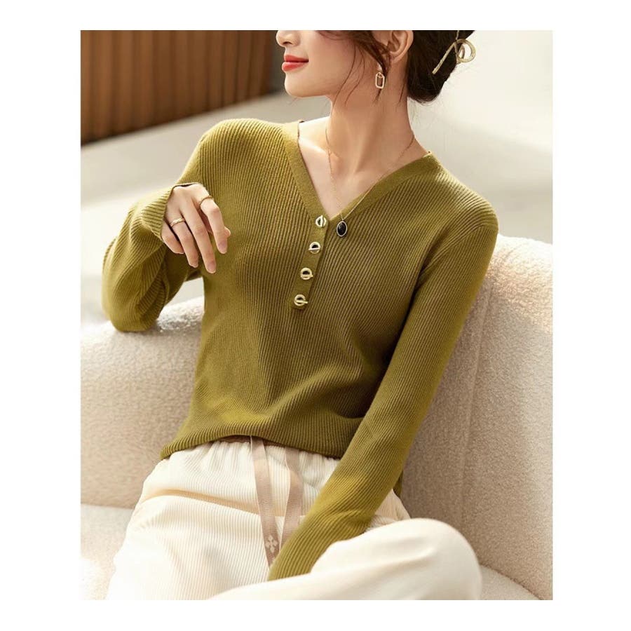 すっきりとしたVネックラインに並んだボタンがアクセントになり、大人の女性らしい抜け感をプラスします。