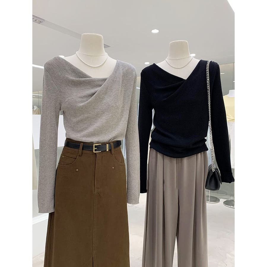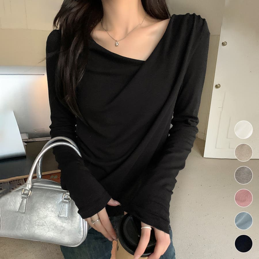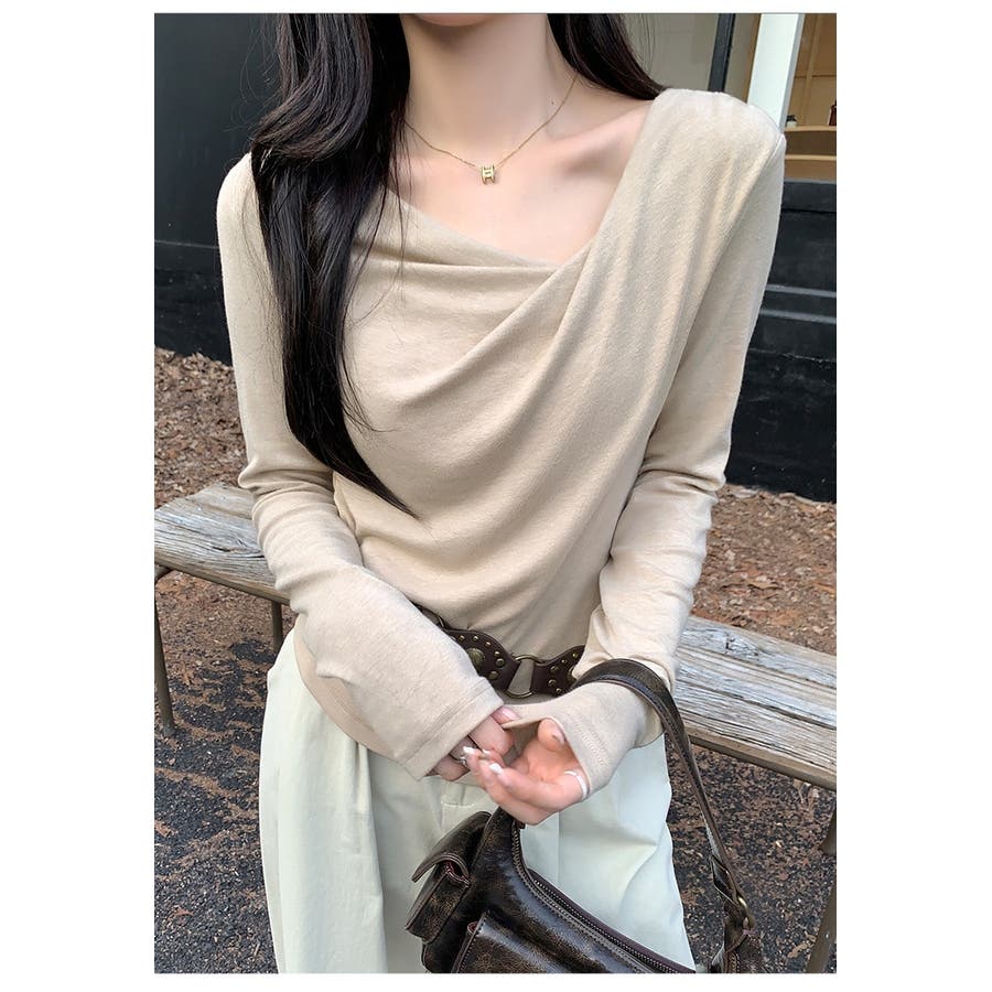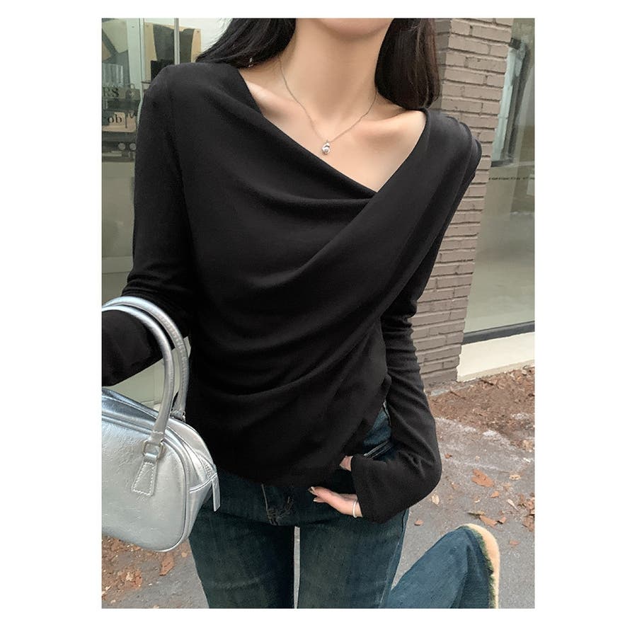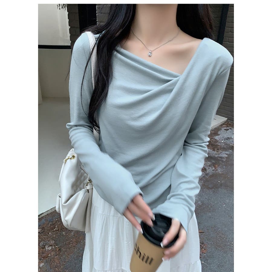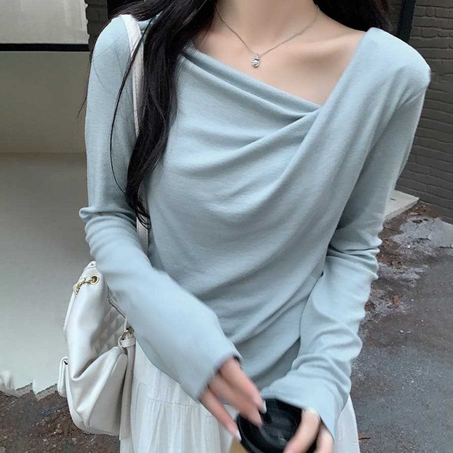 アシンメトリーなネックラインが個性的で、無地のデザインがどんなスタイルにも合わせやすい一枚です。