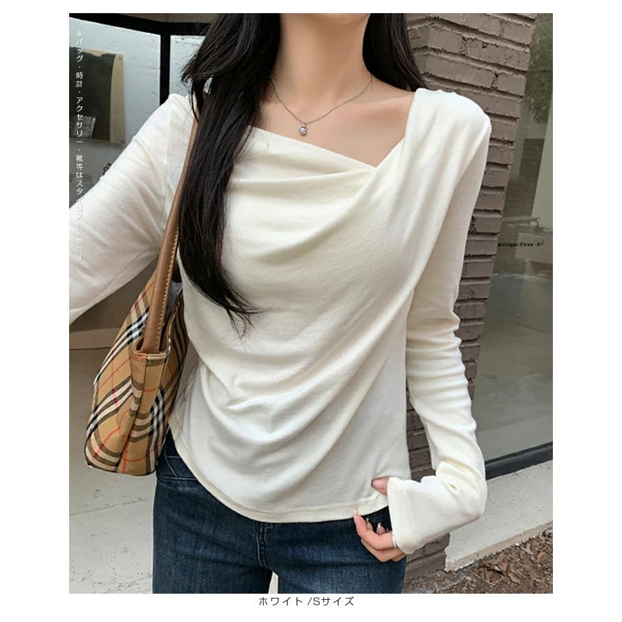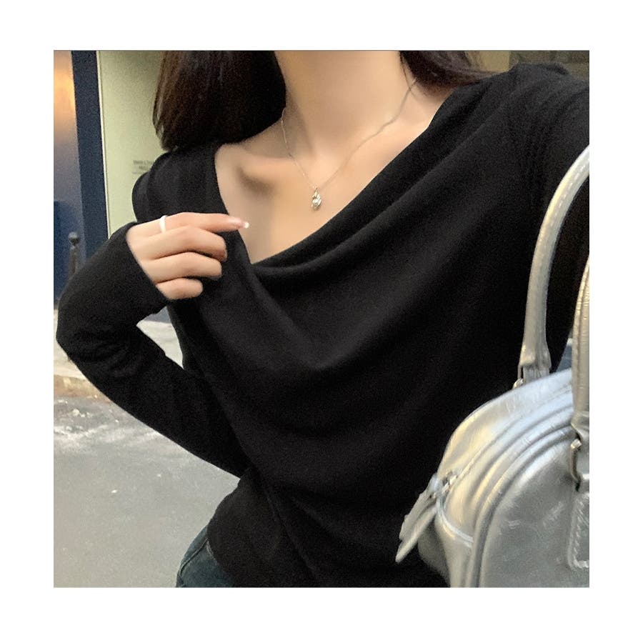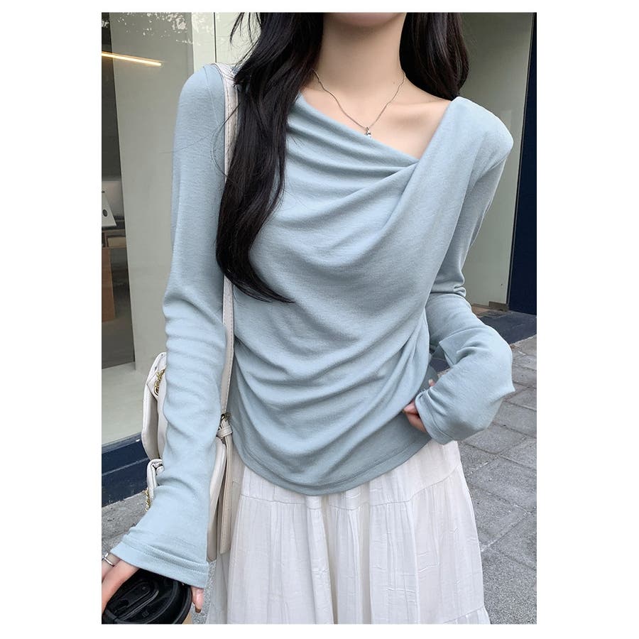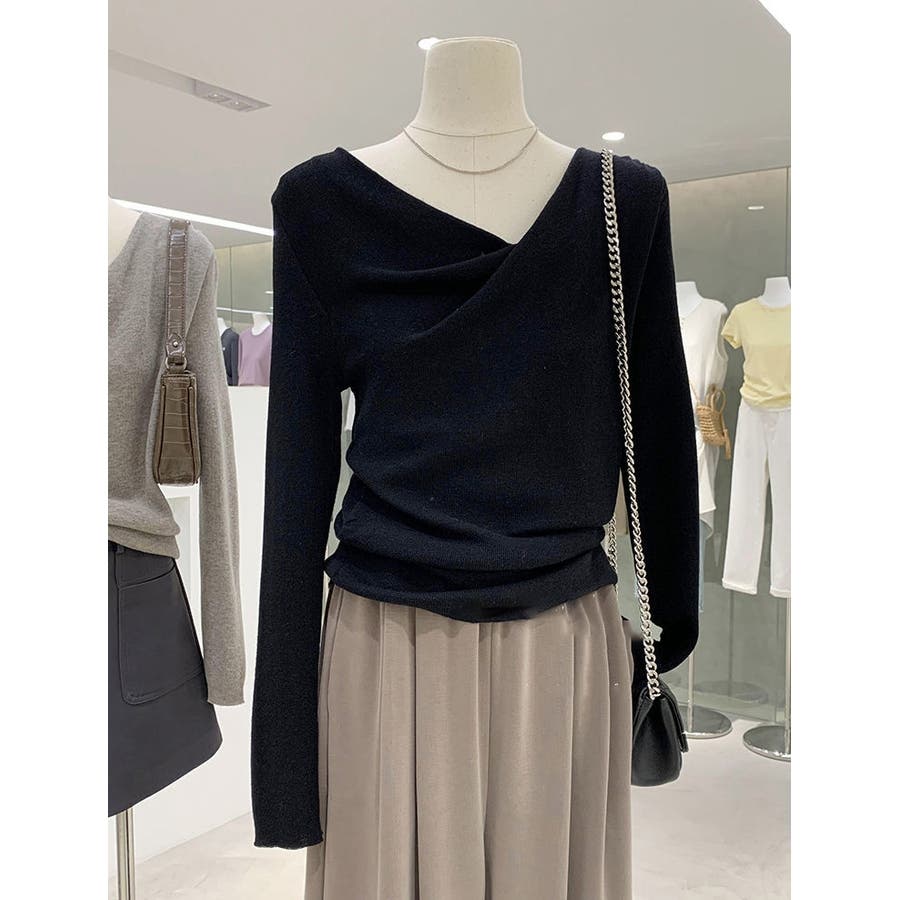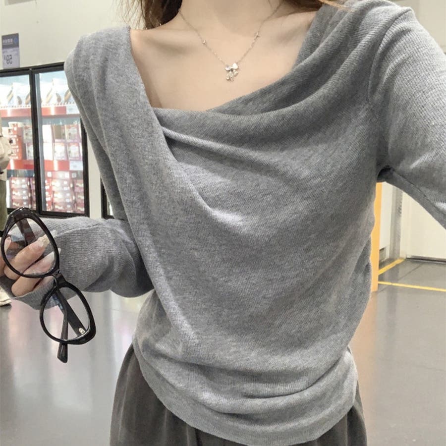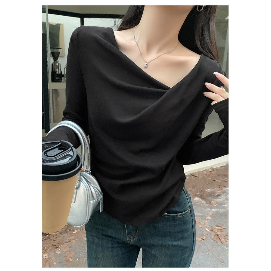 アシンメトリーなネックラインが個性的で、無地のデザインがどんなスタイルにも合わせやすい一枚です。