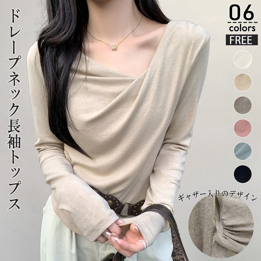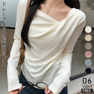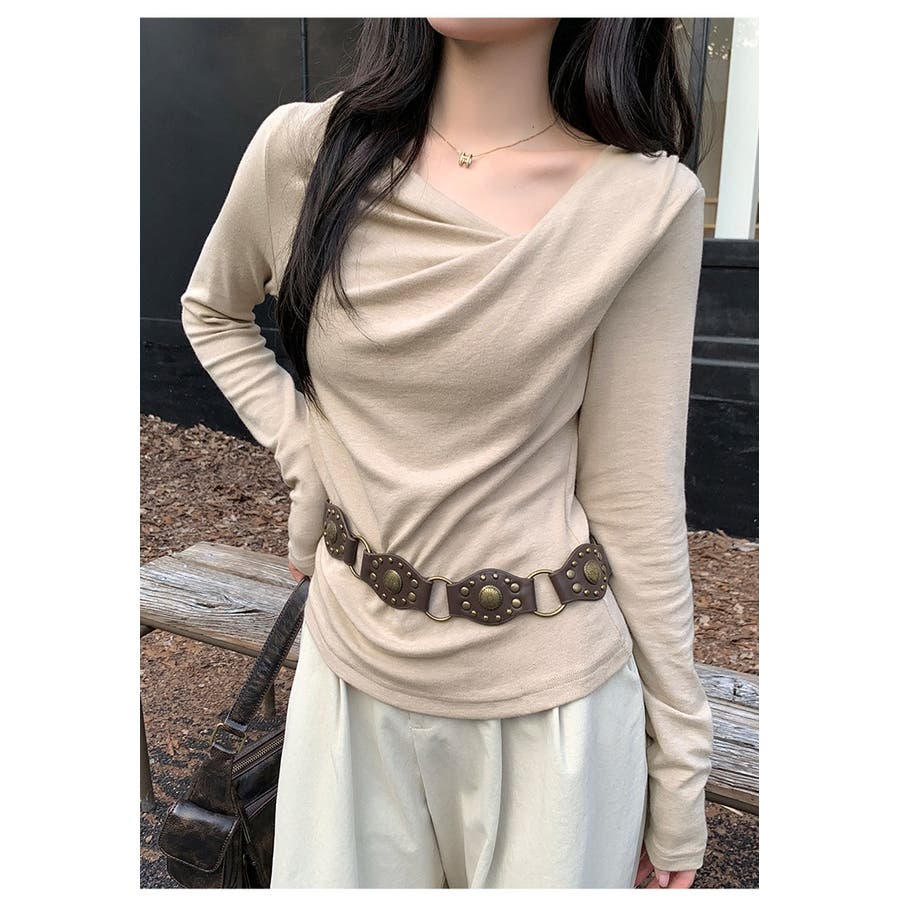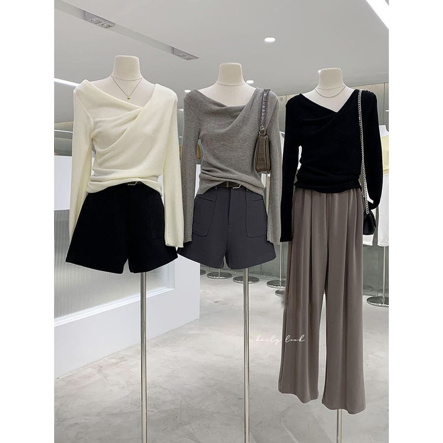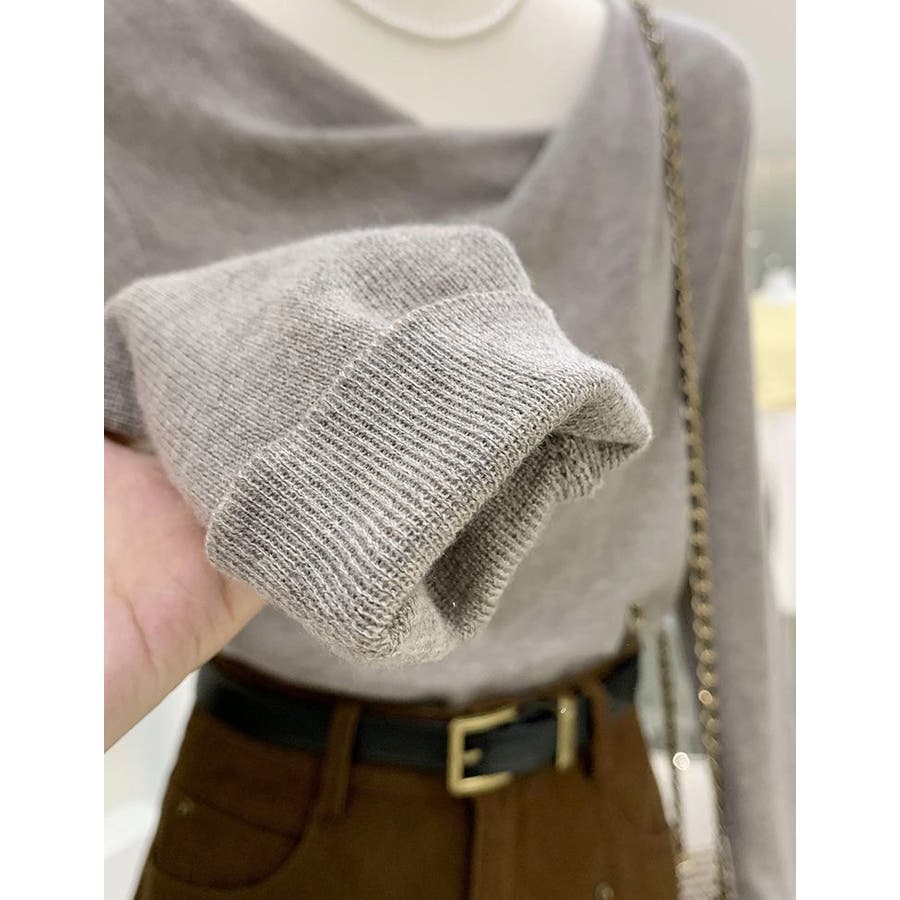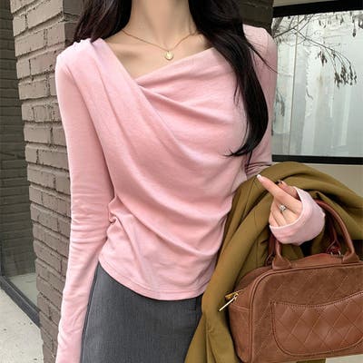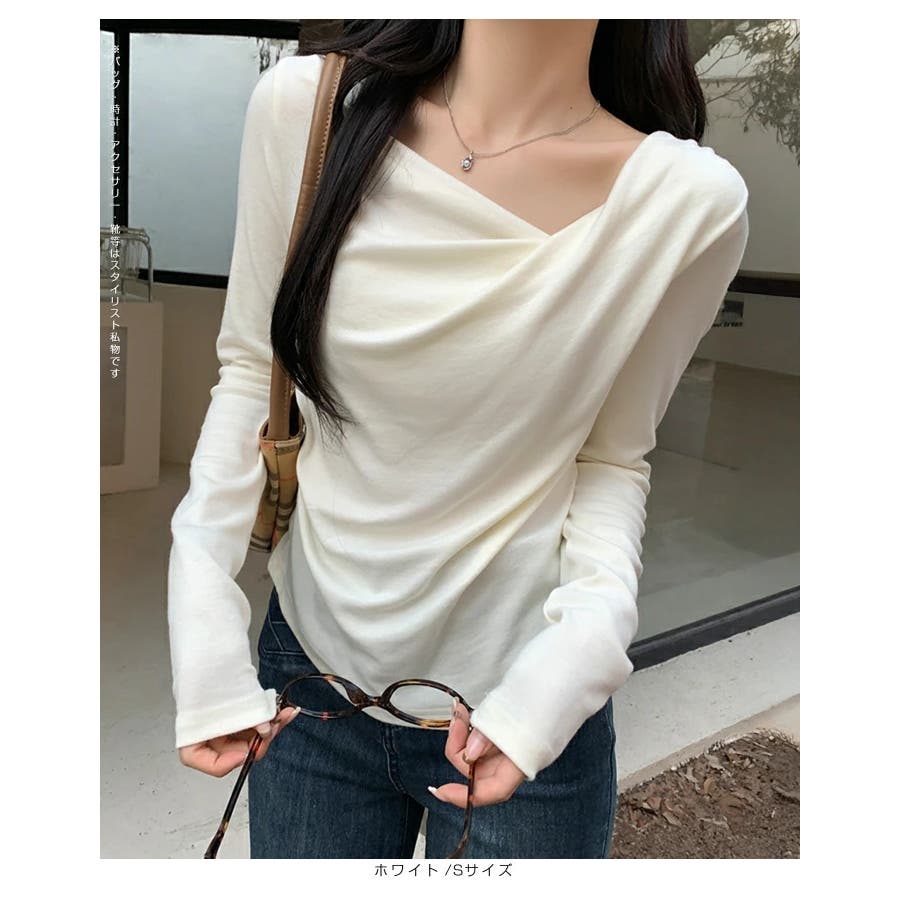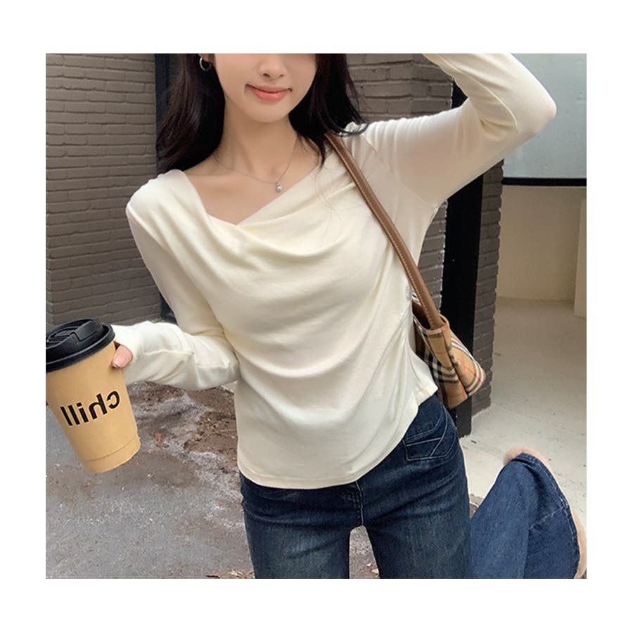 アシンメトリーなネックラインが個性的で、無地のデザインがどんなスタイルにも合わせやすい一枚です。