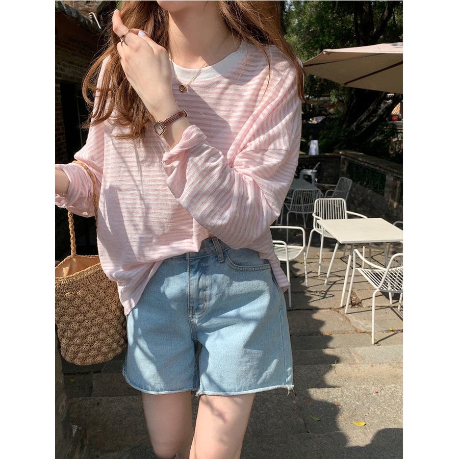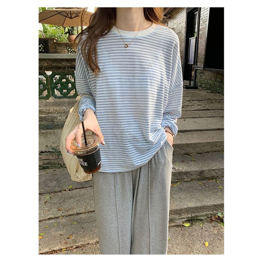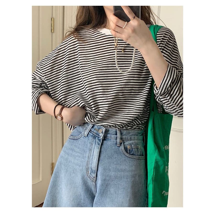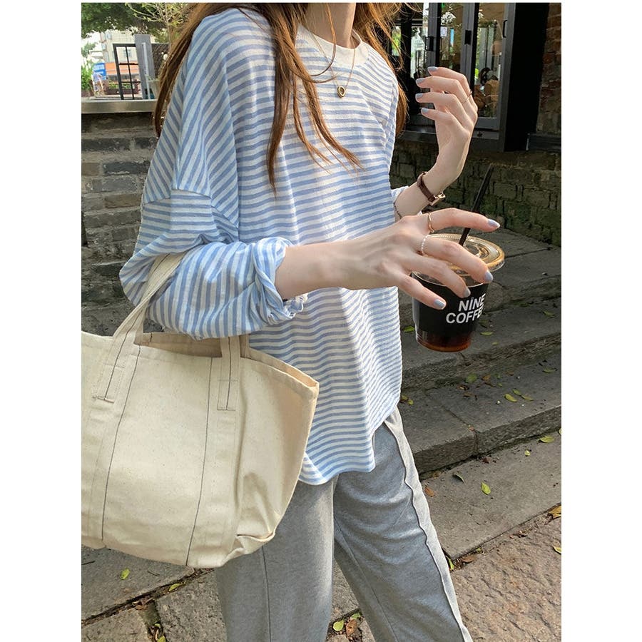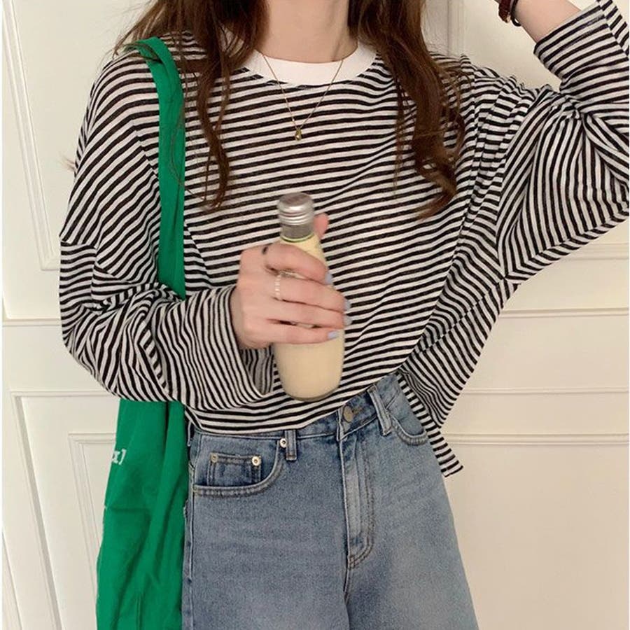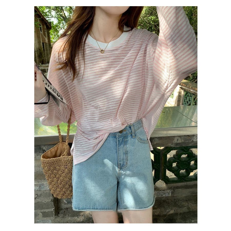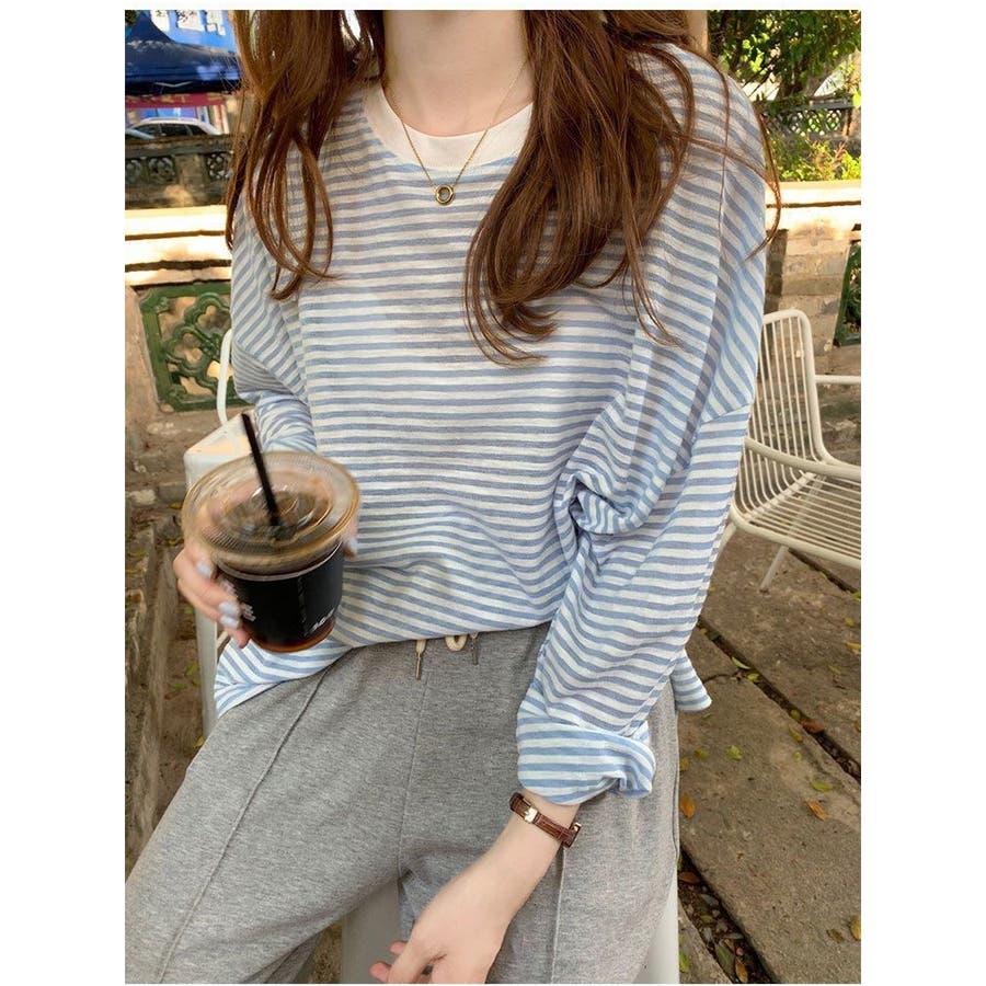 軽やかな素材感が魅力のストライプ柄長袖トップスです。柔らかくて通気性抜群の薄手生地で、日差しをしっかりガードしながら、涼しげで快適な着心地を実現。ゆったりとしたシルエットで体型カバーも