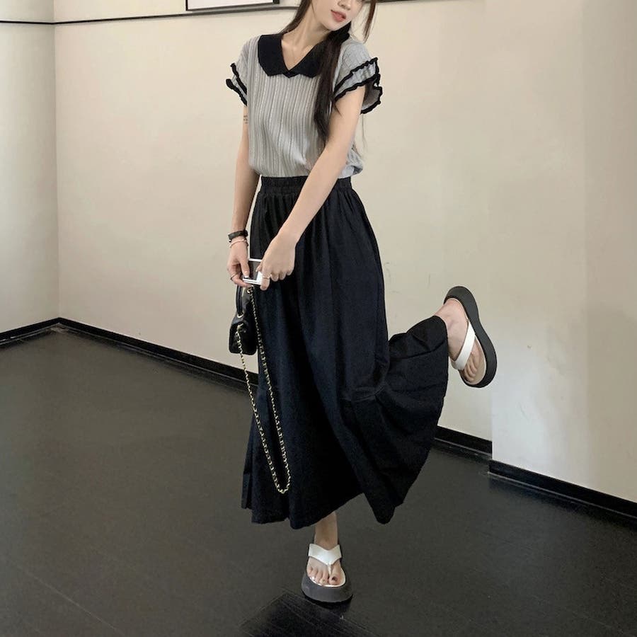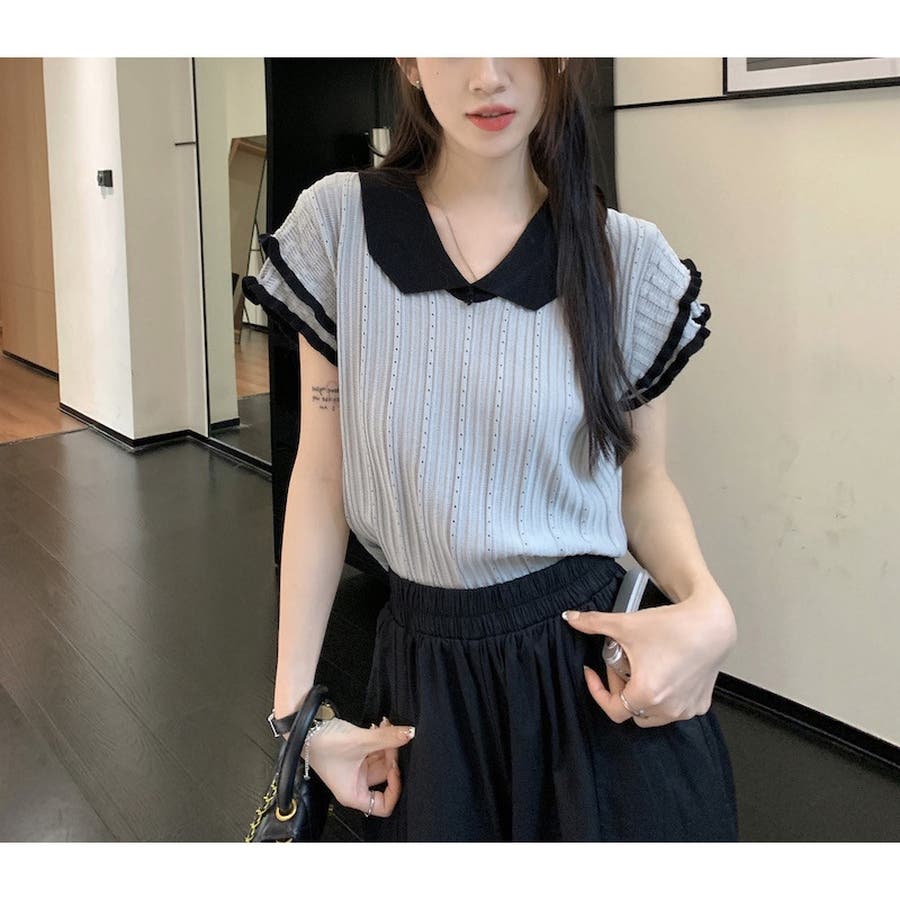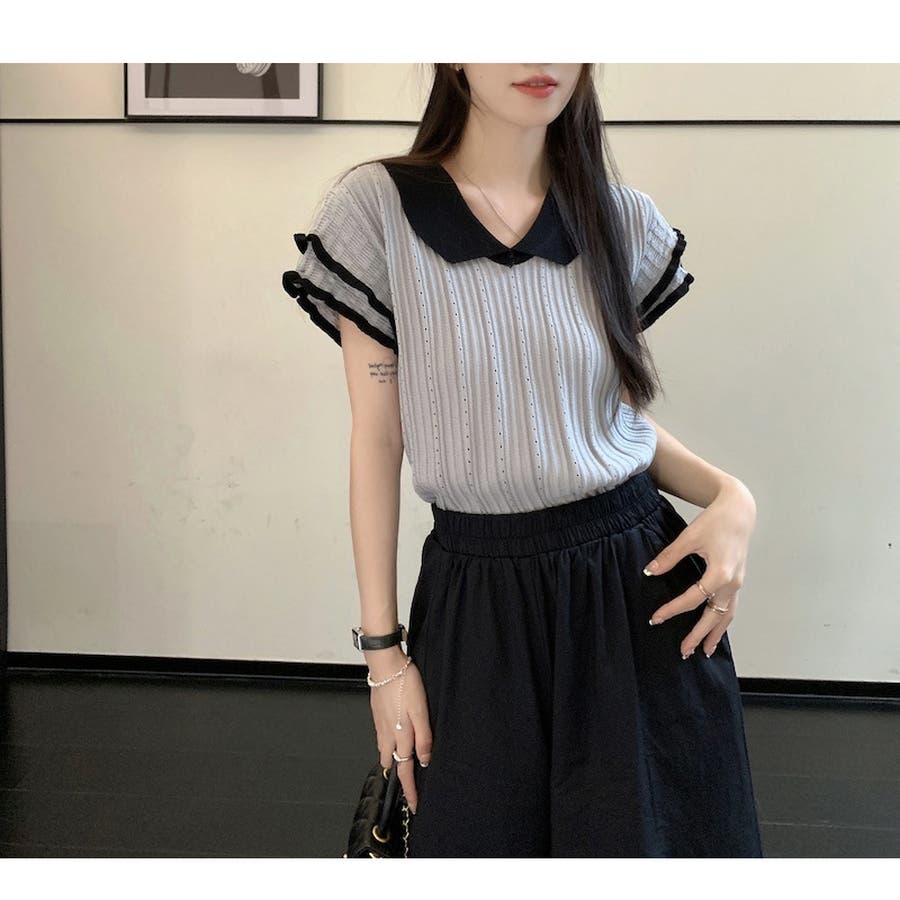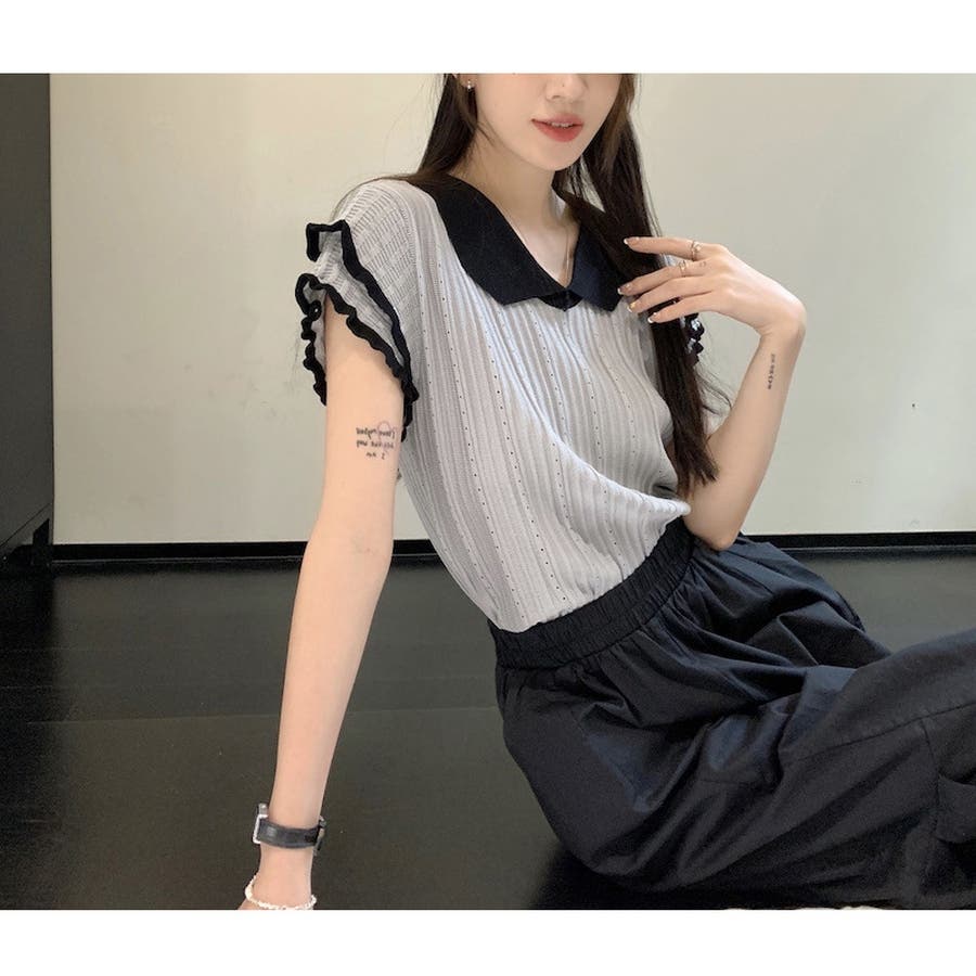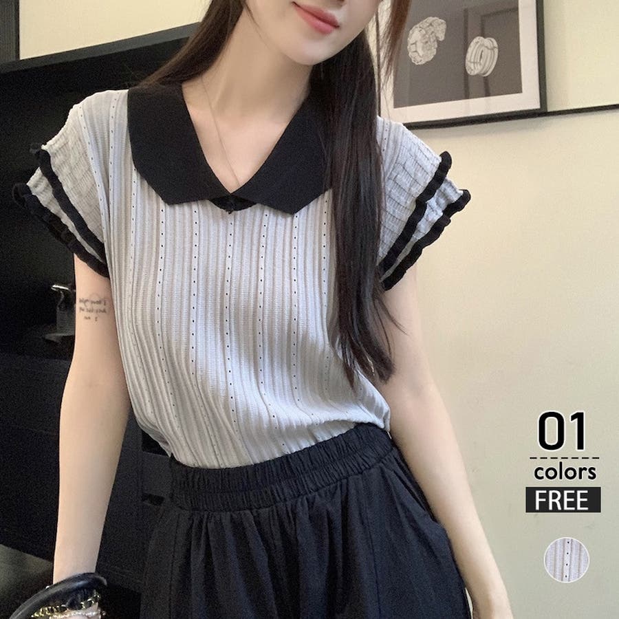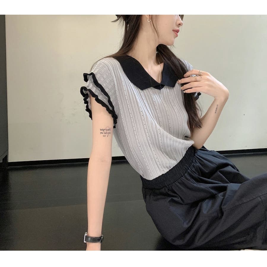 フリル風のフレンチスリーブ、配色デザインでより可愛らしく、腕を華奢に見せてくれます。