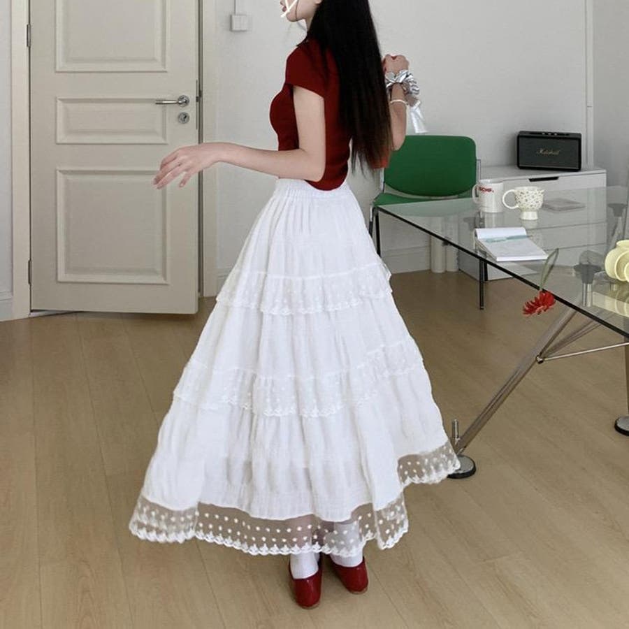 ふんわりと揺れるレース切り替えデザインが魅力のロングスカート
